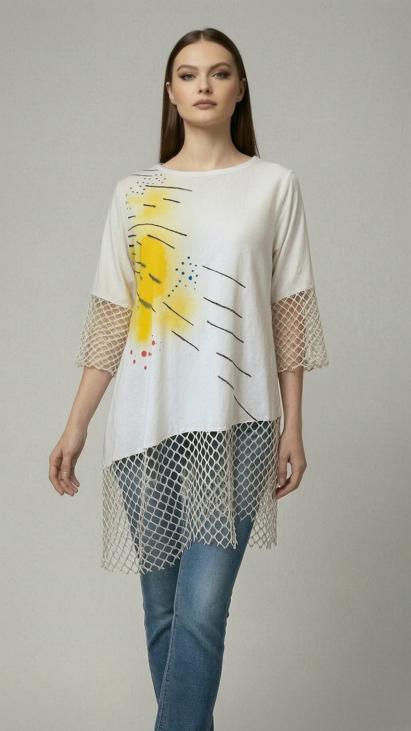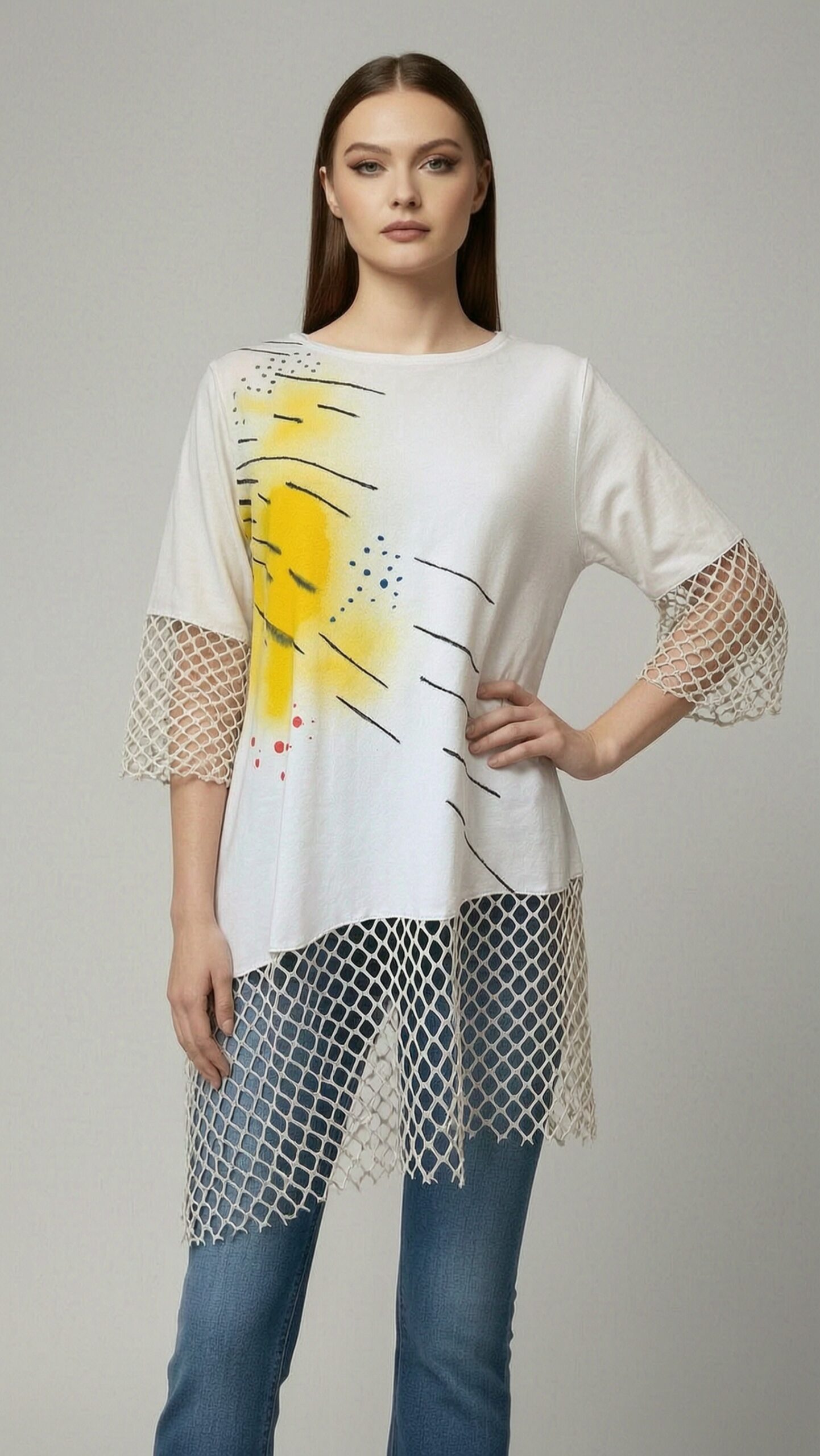 Teksturalni kontrasti: Mrežasti dodaci na 3/4 rukavima i donjem asimetričnom rubu daju tunici unikatan, “edgy” izgled.