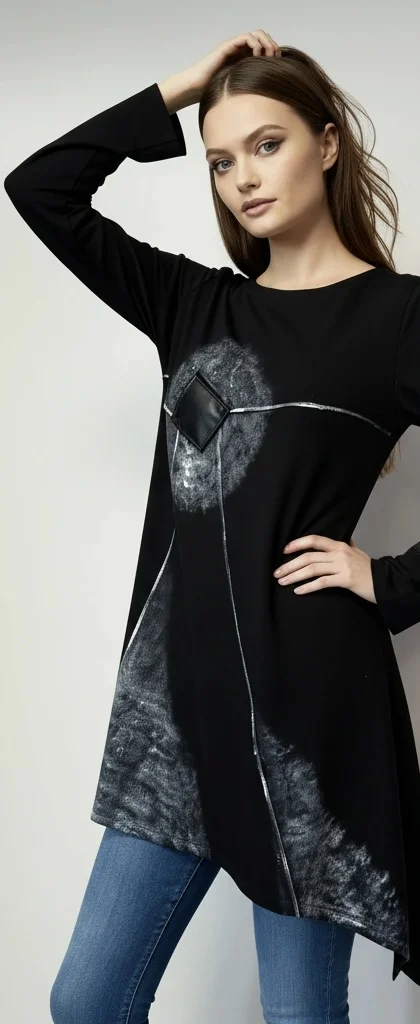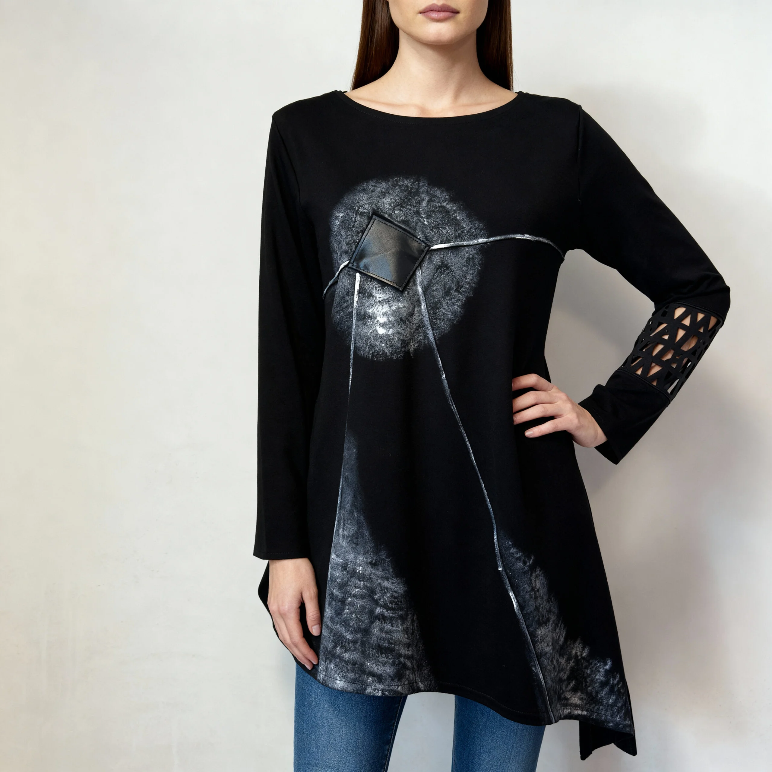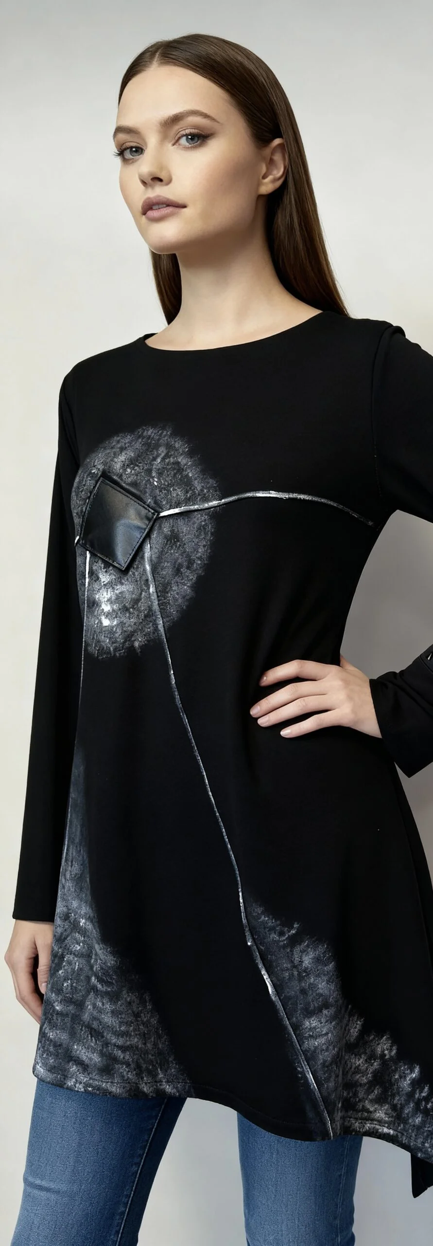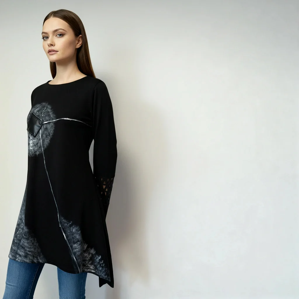 Crna tunika AORWYN donosi spoj umjetničkog izraza i bezvremenskog dizajna. Crna podloga s ručno oslikanim detaljima i unikatnim kožnim umetkom stvara efektan kontrast, dok prozračni geometrijski izrezi na rukavima daju dašak geometrijske igre stila. Savršena za žene koje žele nositi nešto drugačije, udobno i stilski odvažno.