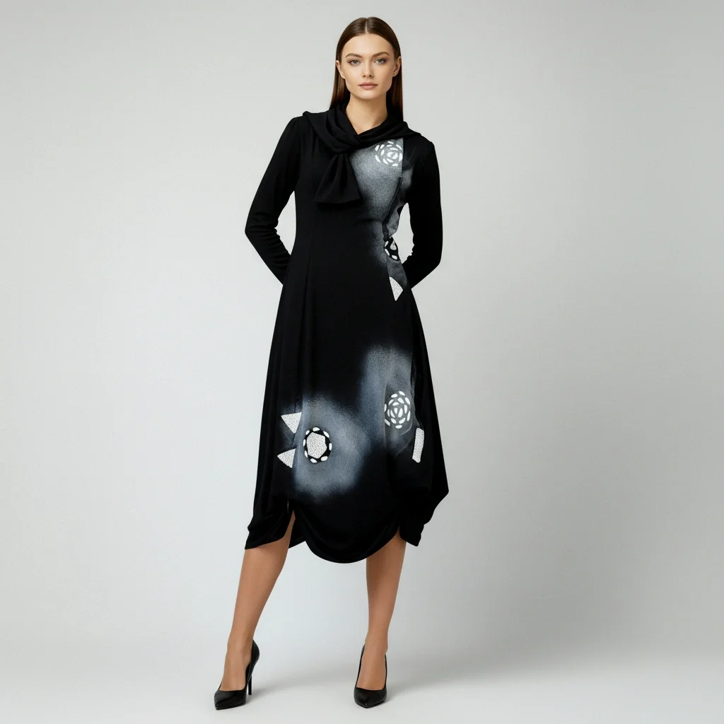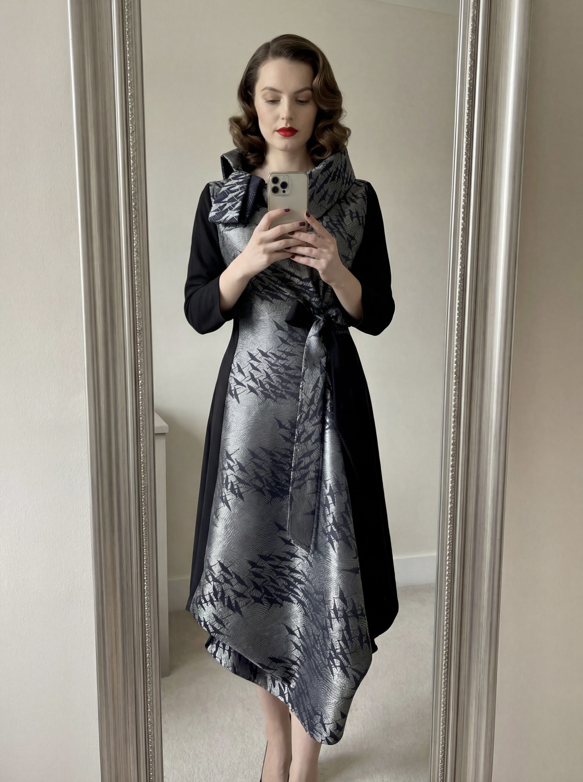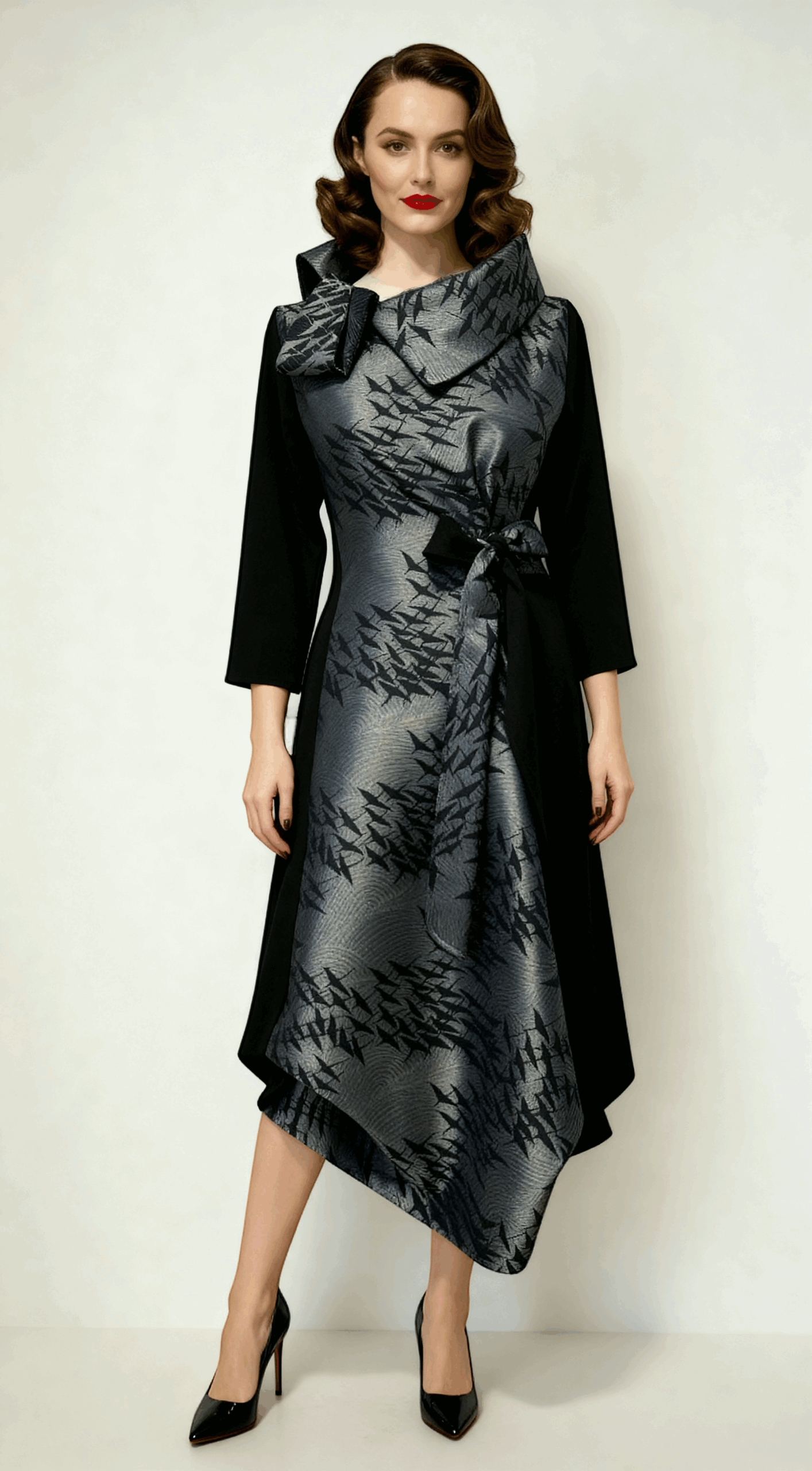 ARGENTA je elegantna midi haljina asimetričnog kroja izrađena u kombinaciji mat crnog materijala i luksuznog sivog brokata s apstraktnim uzorkom. Naglašeni ovratnik, dekorativna mašna i fluidna silueta stvaraju sofisticiran izgled s retro prizvukom. Model ističe struk, vizualno izdužuje figuru i djeluje izrazito profinjeno. Idealna za večernje prilike, svečanosti i posebne događaje.
