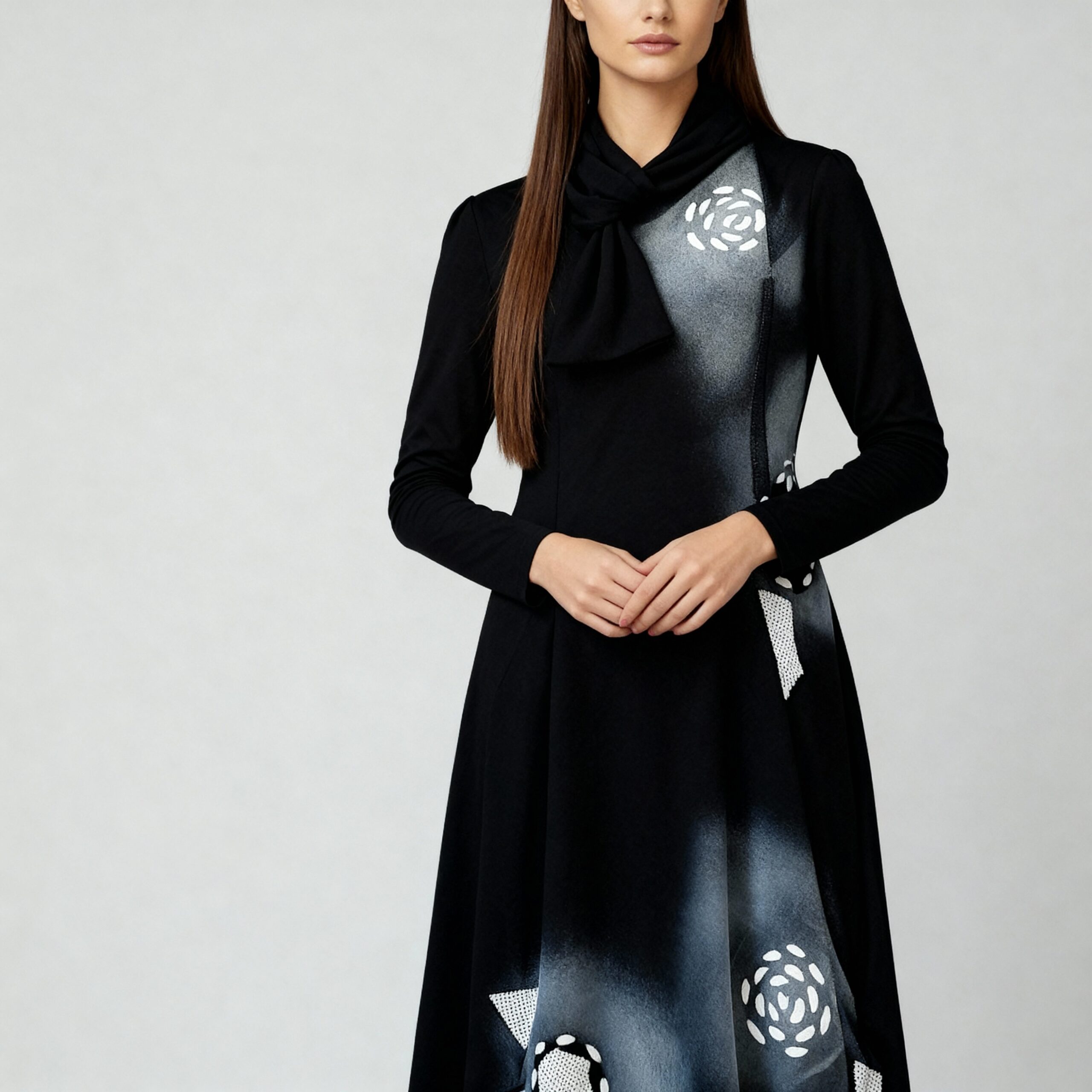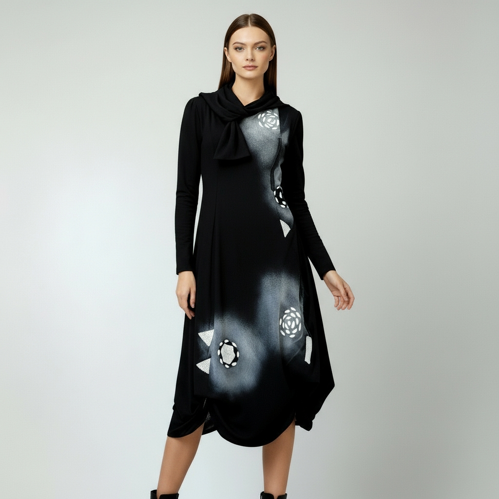 Haljina ART donosi spoj umjetnosti i mode – crna podloga obogaćena ručno oslikanim detaljima i apstraktnim formama. Udobna, elegantna i jedinstvena, idealna je za posebne prilike i izražavanje osobnog stila. Duljina se može regulirati po želji uz pomoć petljica.