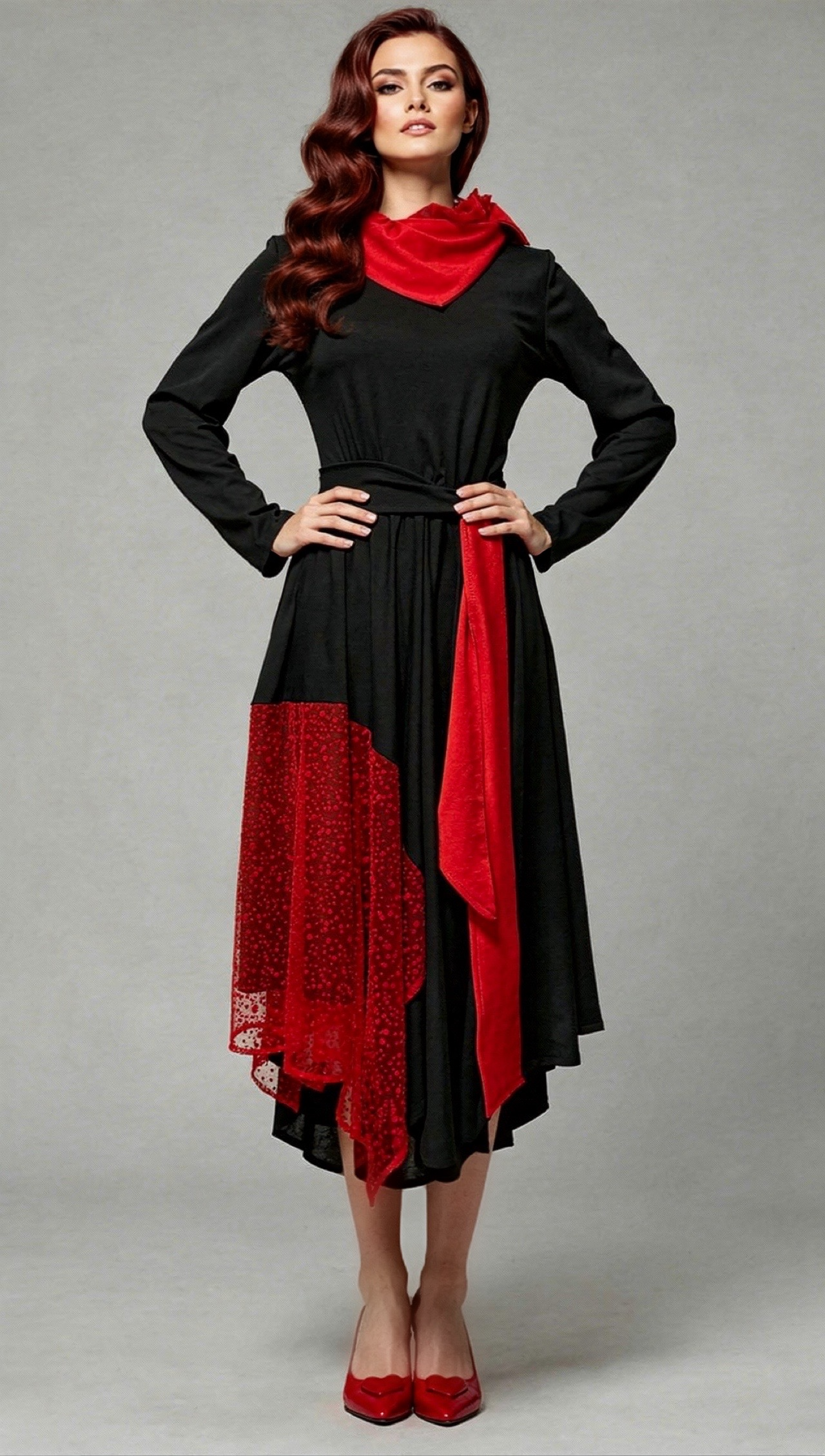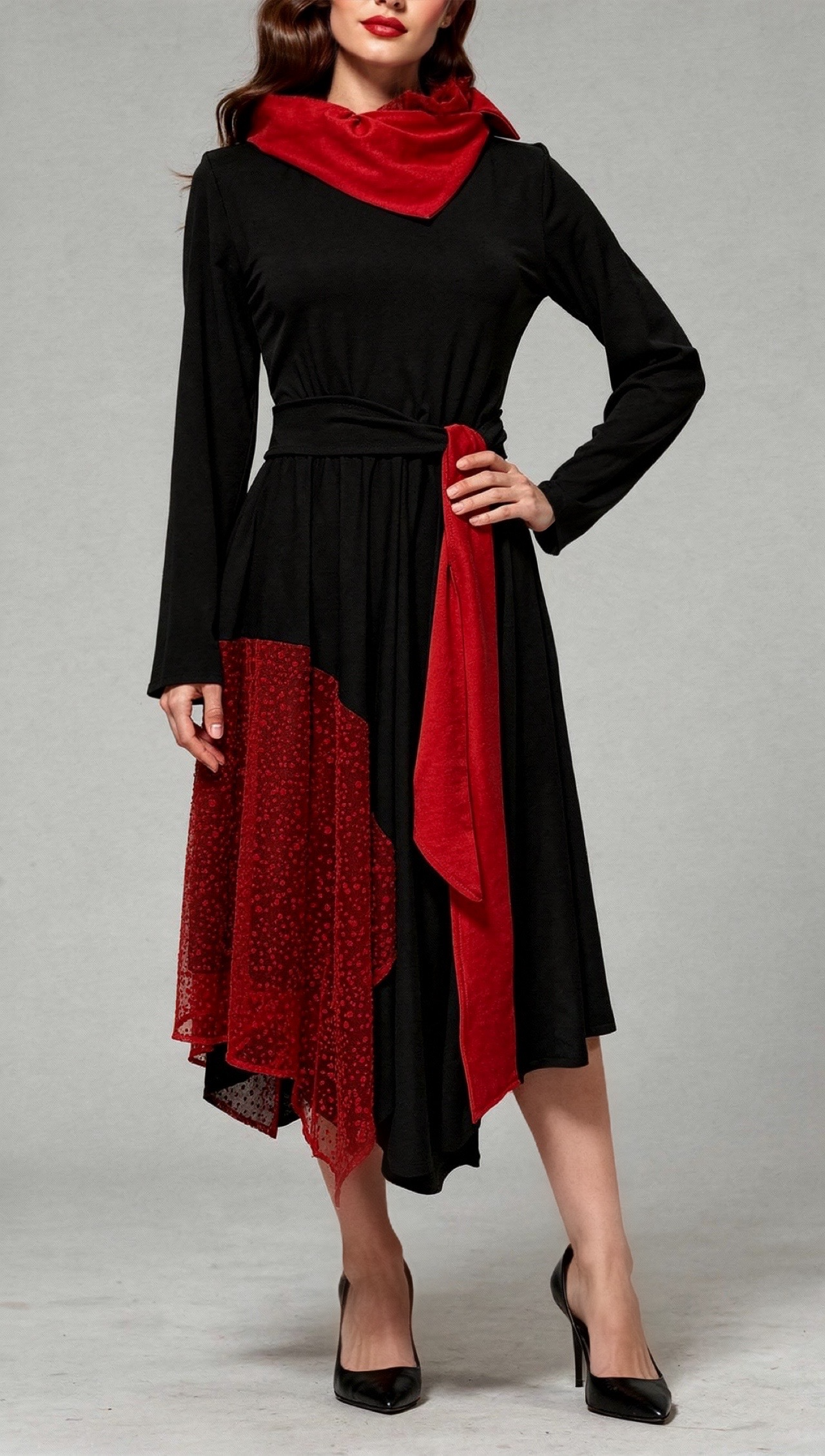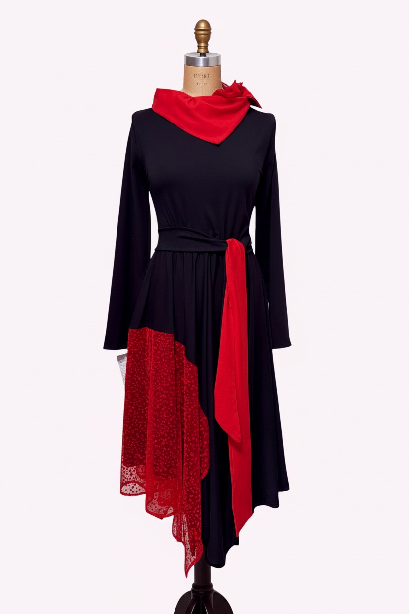 Haljina BARBARA ističe siluetu kroz asimetrični kroj, kontrast crne i crvene te naglašeni pojas u struku. Elegantna, ženstvena i upečatljiva – za žene koje žele izgled s karakterom.