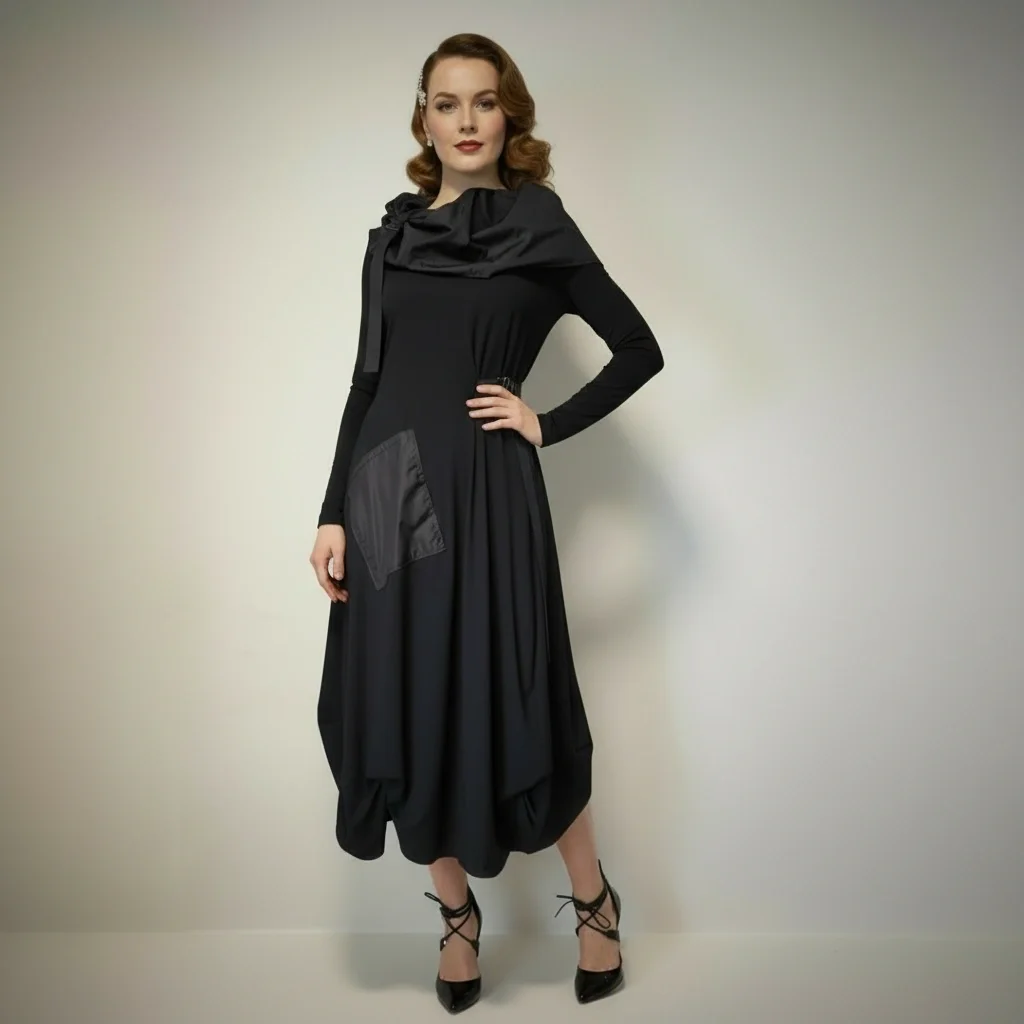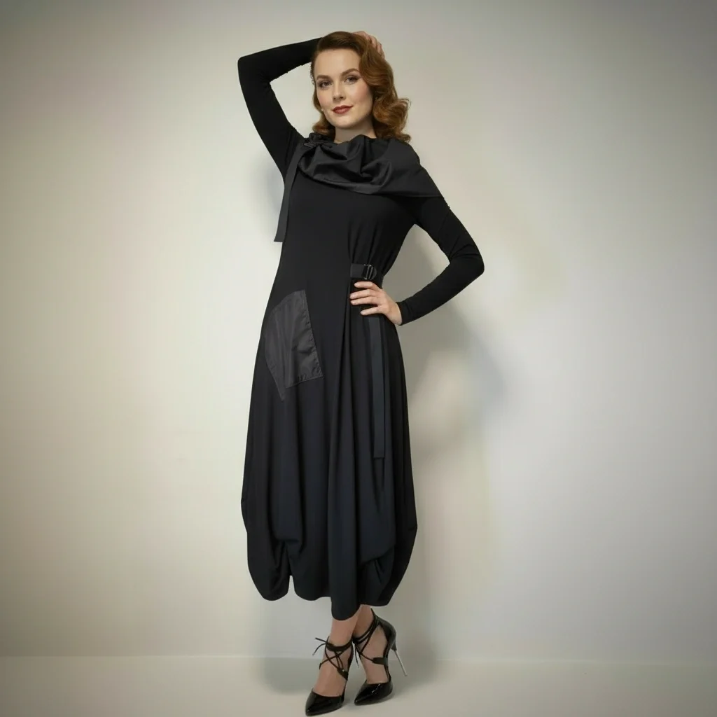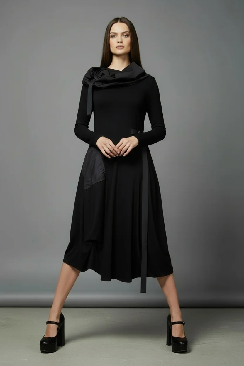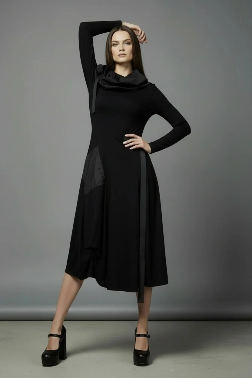 Haljina BUGA odiše elegancijom i avangardnim dizajnom. Crna midi silueta s dugim rukavima i decentnim asimetričnim detaljima stvara sofisticiran, a istovremeno neodoljiv izgled. Savršena je za žene koje žele istaknuti svoju snagu i stil kroz profinjenu jednostavnost.