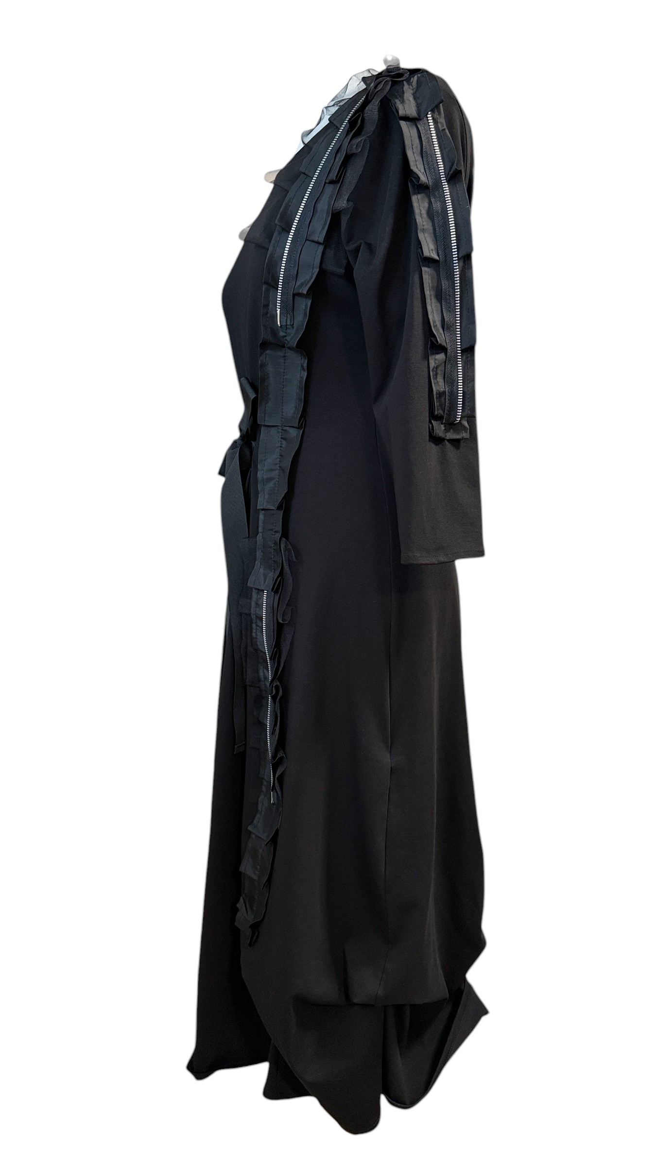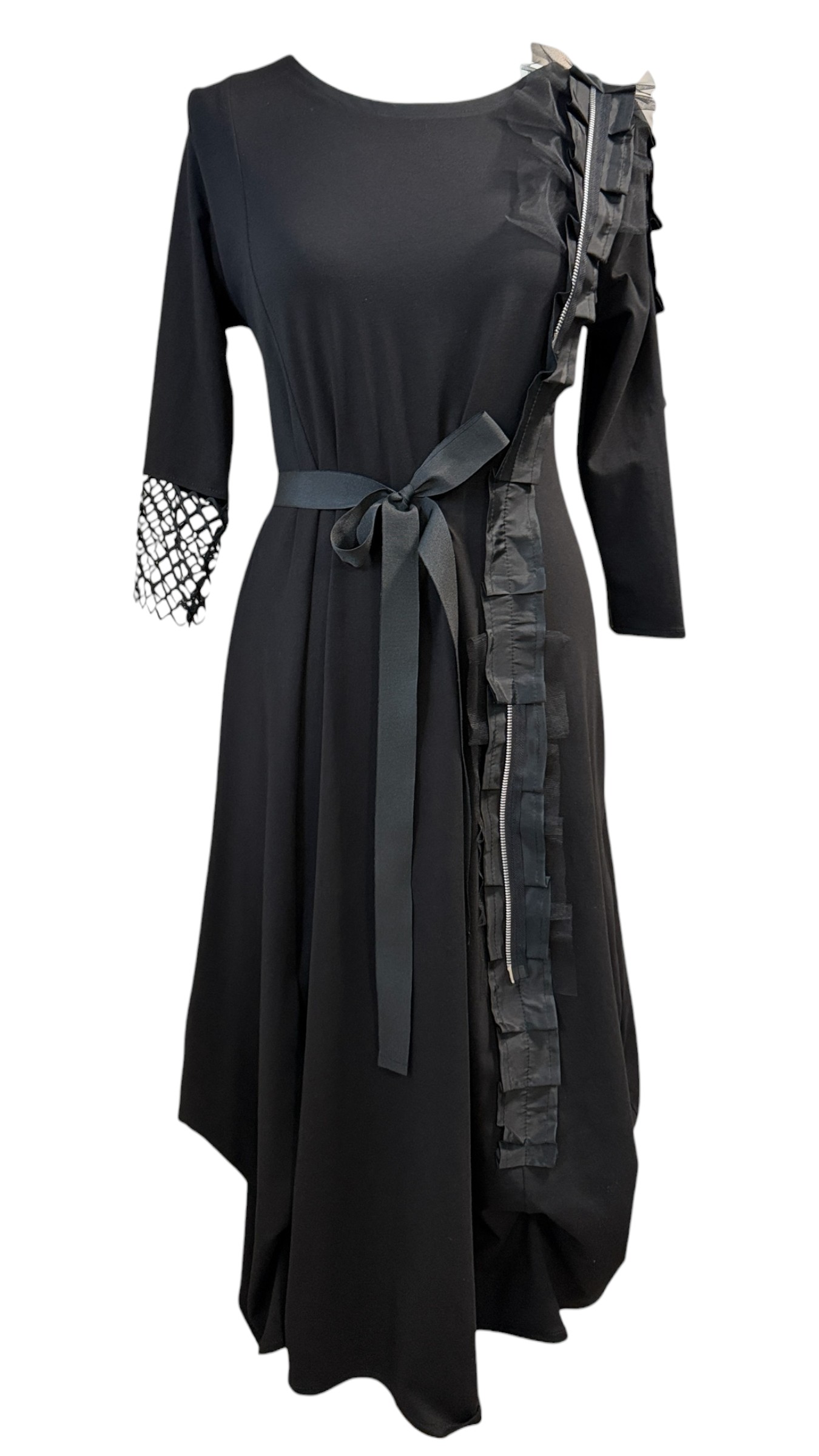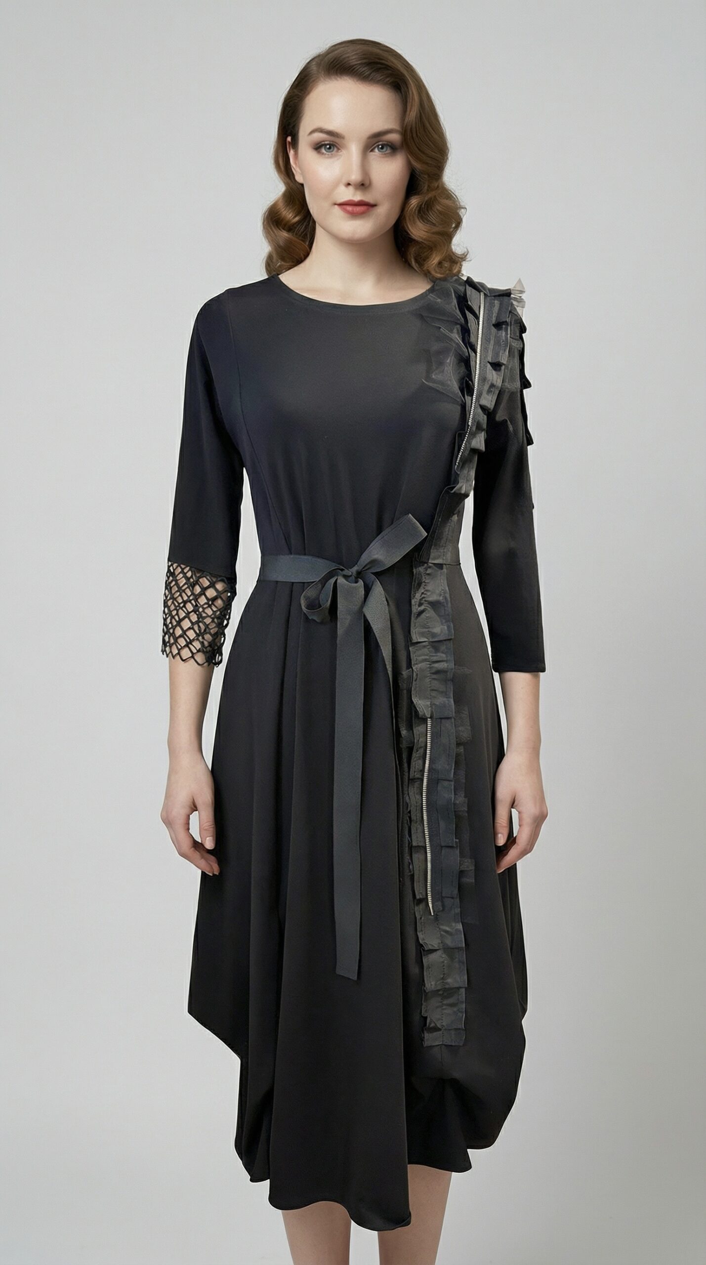 Mekano padajuća tkanina prati liniju tijela bez stezanja, dok pojas omogućuje prilagodbu siluete i naglašavanje struka. Asimetrični vertikalni detalji i slojevita tekstura unose dinamiku i vizualnu dubinu, čineći ovu haljinu drugačijom od klasičnih crnih modela.