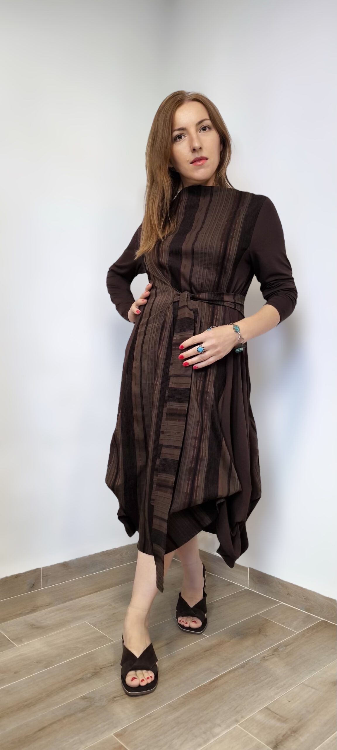 Haljina DARIA odiše profinjenošću i umjetničkim duhom – tamna čokoladna nijansa isprepletena suptilnim prugama stvara igru svjetla i sjene, dok asimetričan rub i pojas naglašavaju slobodu pokreta i ženstvenu siluetu. Elegantna i mistična, savršen je izbor za one koje žele izgledati posebno i drugačije.