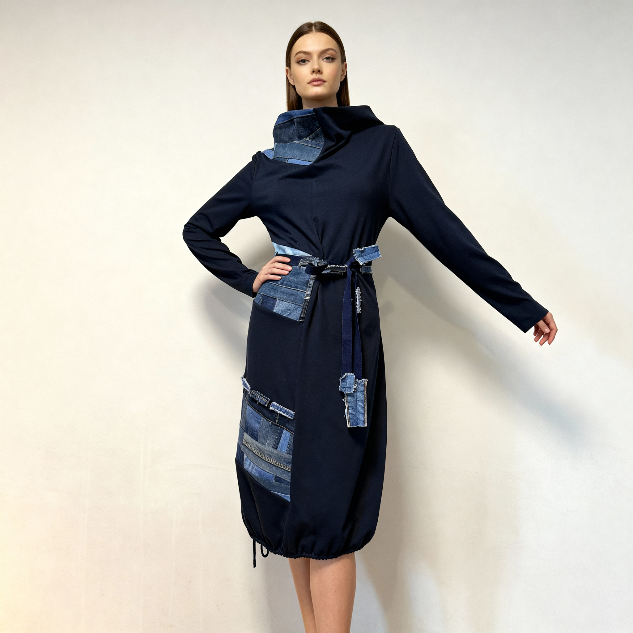 Haljina DENA donosi savršen spoj elegancije i umjetničkog izraza. Tamnoplava baza ističe se ručno izrađenim denim patchwork detaljima koji stvaraju suvremen kontrast i pričaju priču o individualnosti. Asimetričan ovratnik, podesivi pojas i lagano nabrani rub daju haljini dinamičan, urban karakter. DENA je idealna za žene koje vole istaknuti svoj stil – hrabro, ali s dozom profinjenosti.