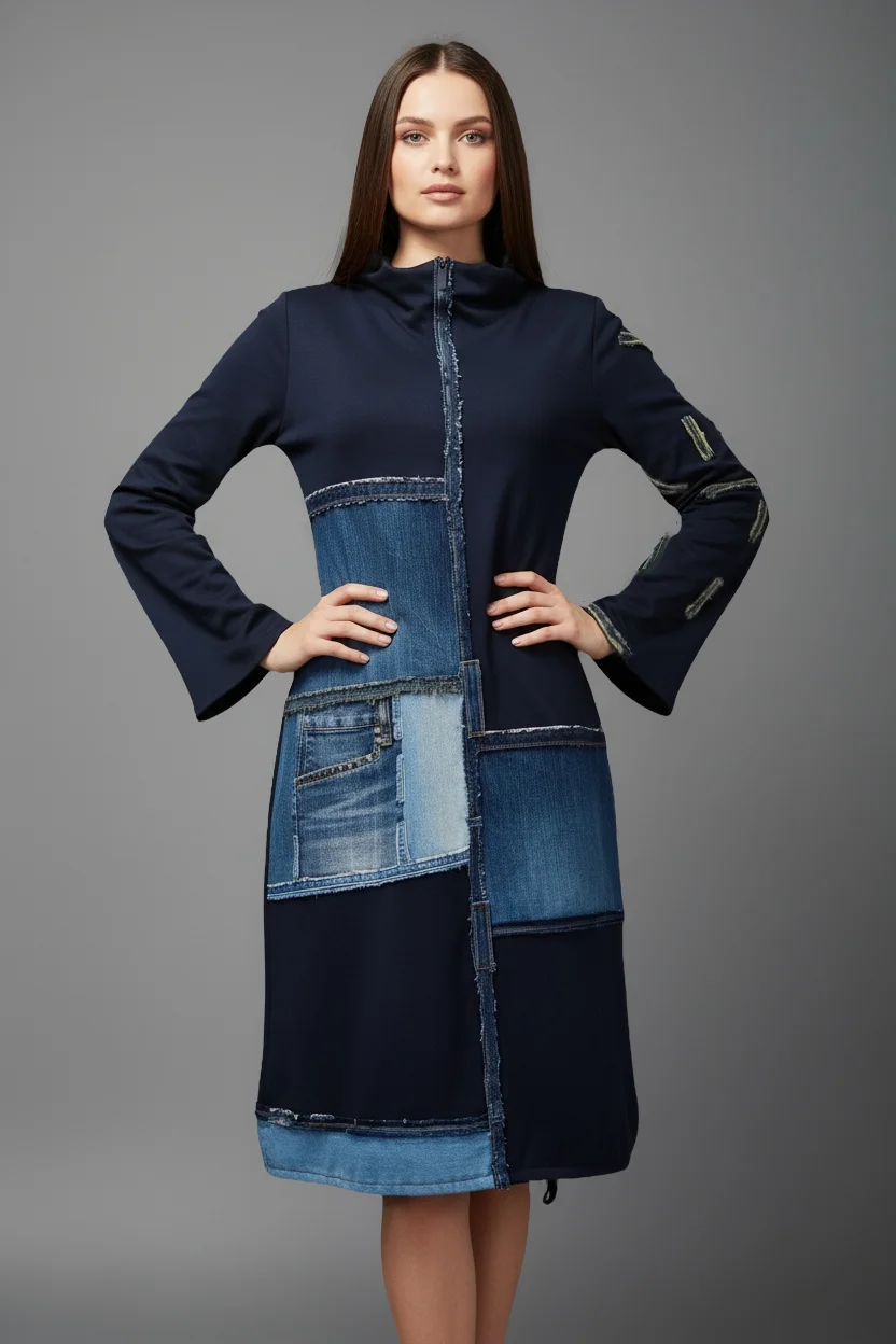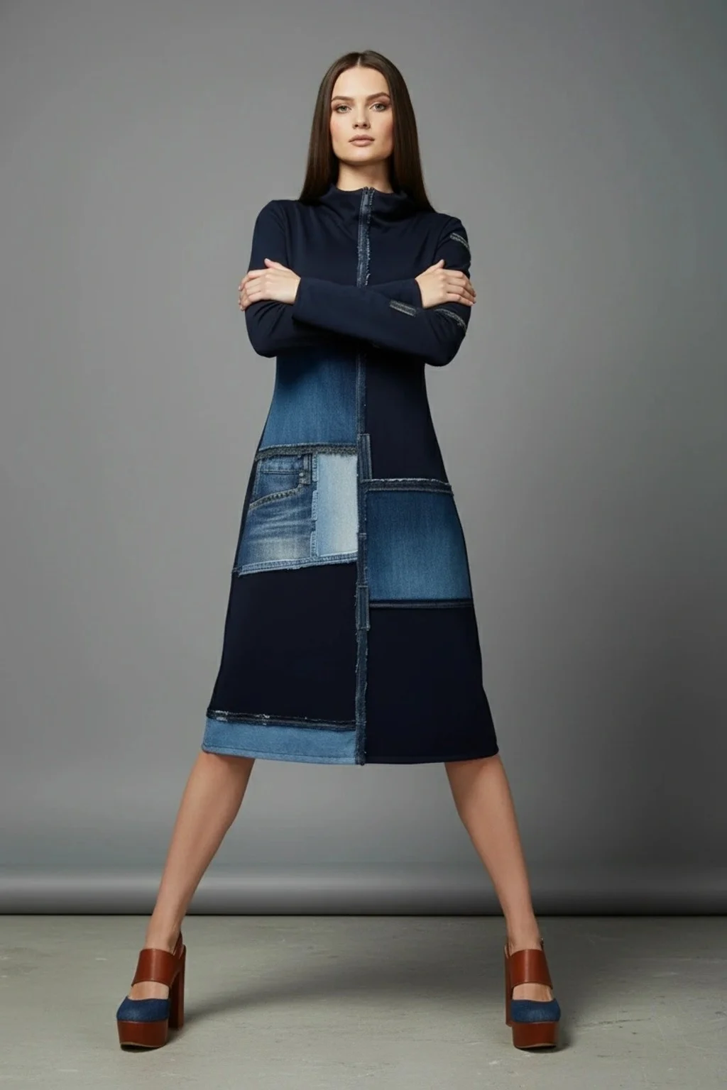 Ova posebna haljina ističe se spojem tamnoplavog materijala i upečatljivih jeans zakrpa u patchwork stilu. Dugi rukavi i ravni kroj čine je udobnom za svakodnevno nošenje, dok inovativni dizajn daje neodoljiv izgled idealan za sve prigode.