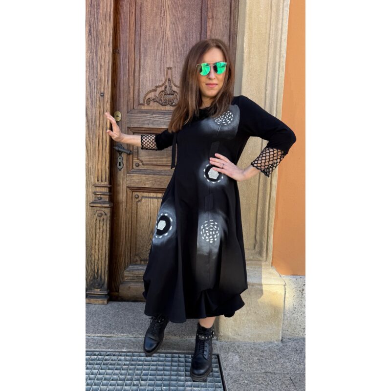 Haljina ELODIE spoj je umjetničkog izraza i udobne elegancije! Crna asimetrična silueta s ručno oslikanim detaljima i teksturalnim akcentima stvara odvažan, ali sofisticiran look. Mrežasti rukavi dodaju dozu provokativne ženstvenosti, dok lepršavi kroj osigurava slobodu pokreta. Idealna za žene koje vole nositi unikatne komade s karakterom!