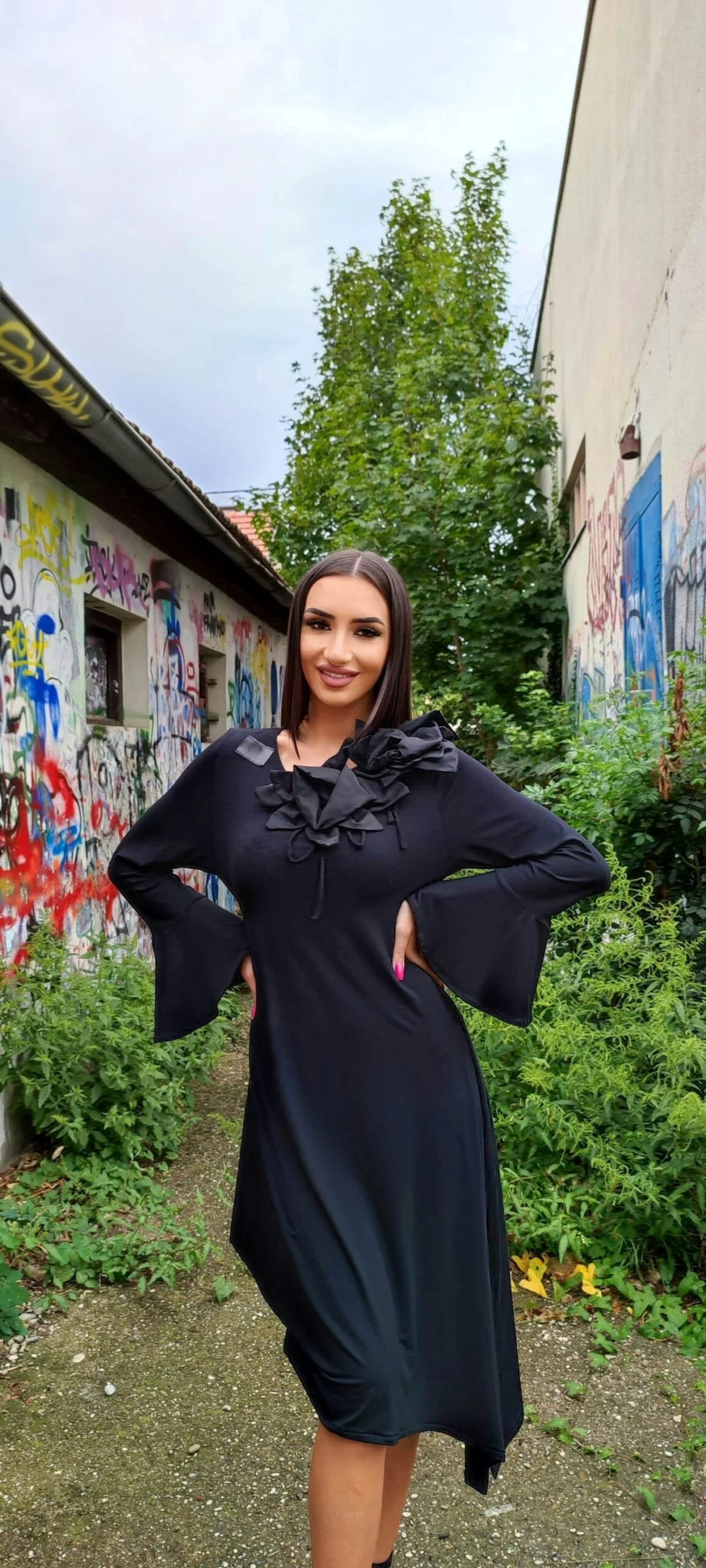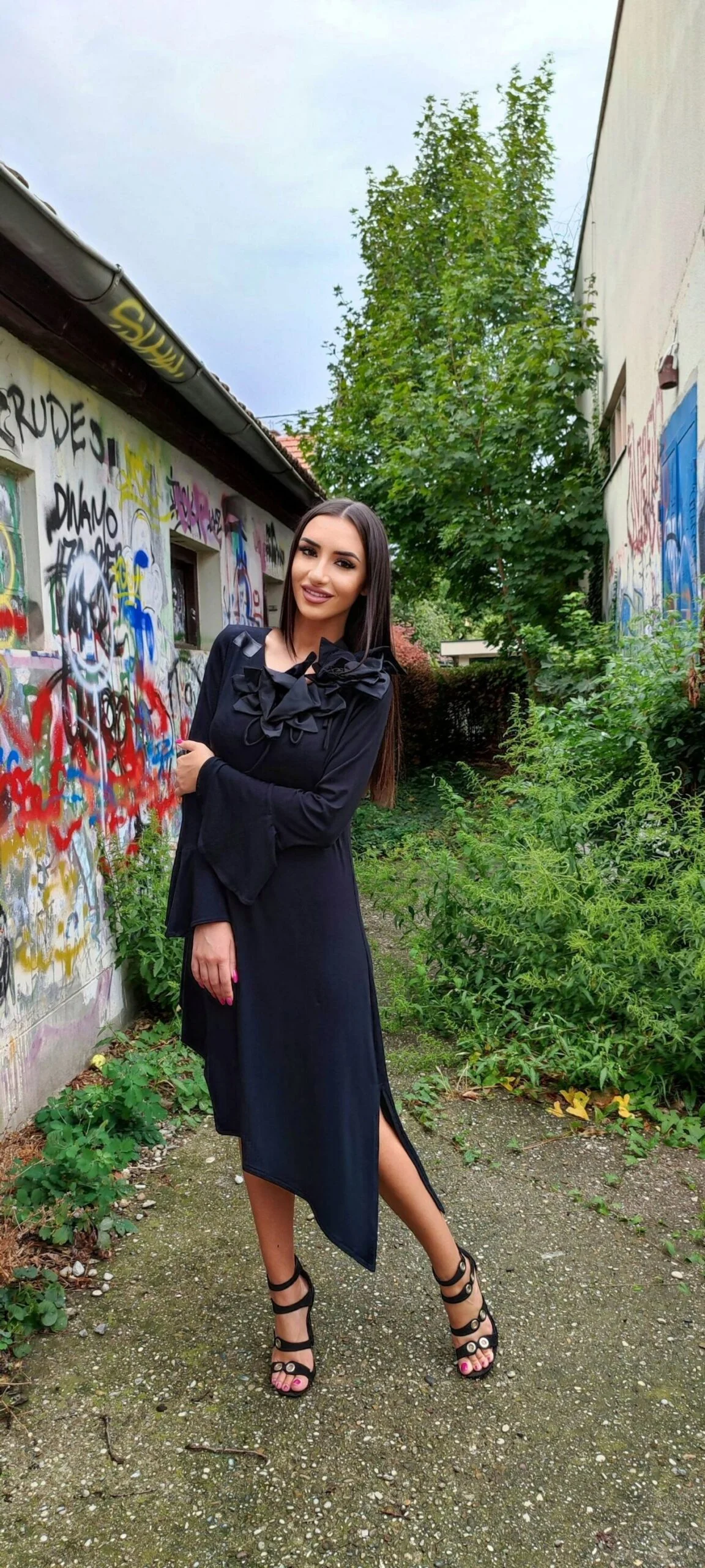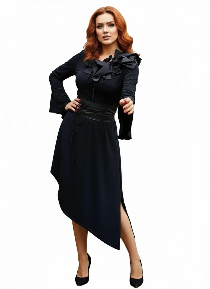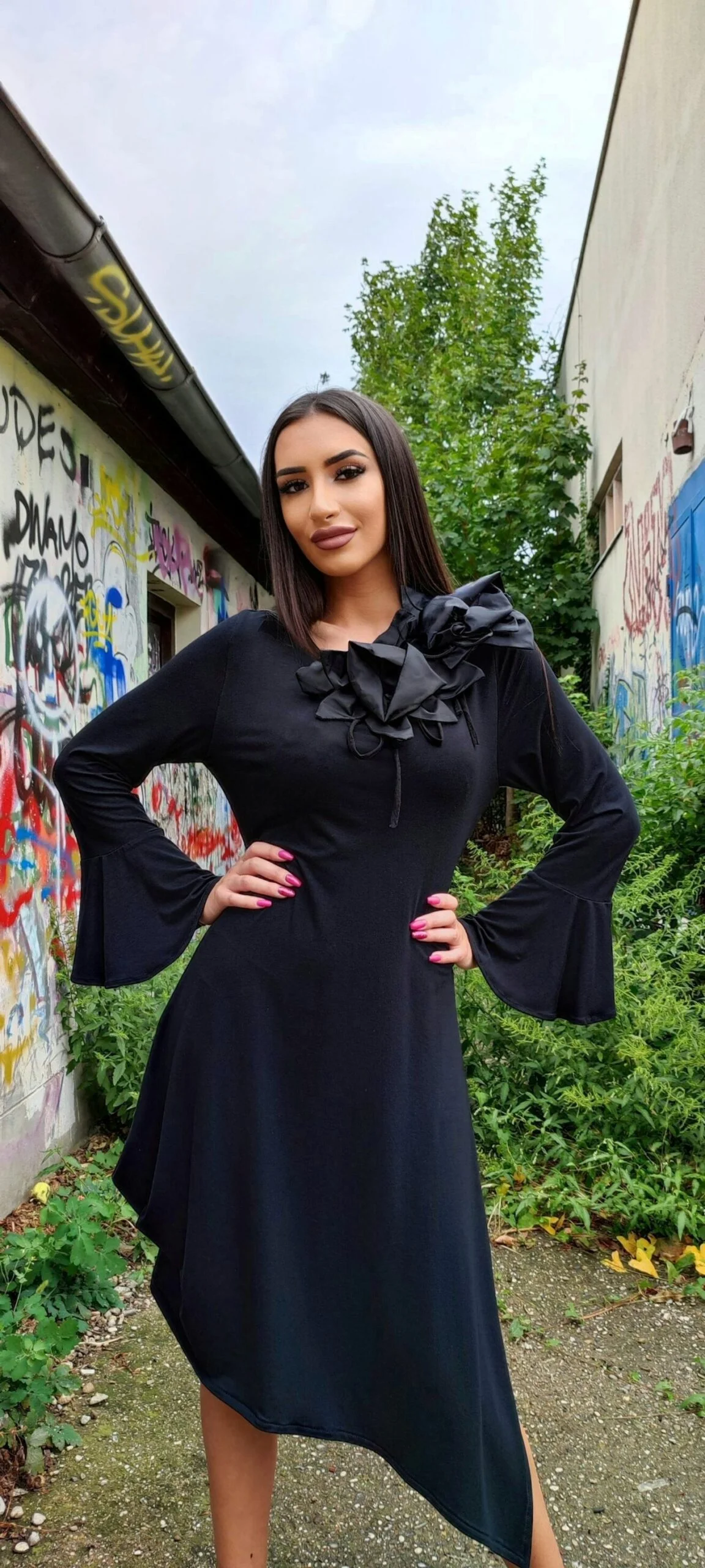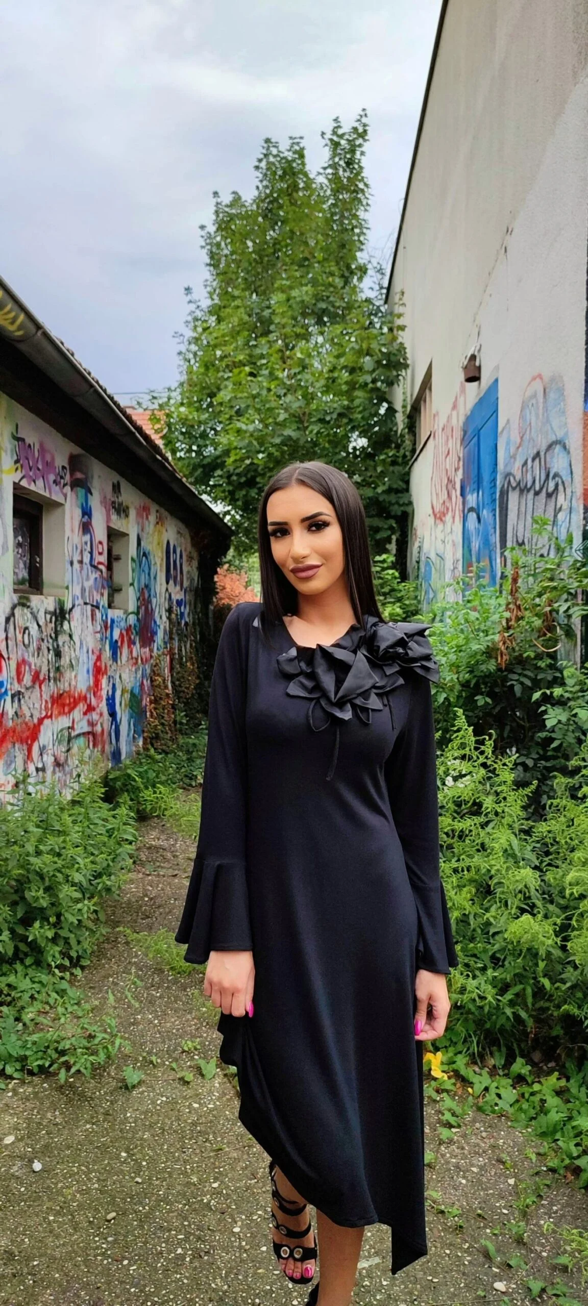 Haljina KAJA donosi sofisticiranost s asimetričnim krojem, raskošnim cvjetnim detaljem i remenom koji naglašava struk. Idealna za posebne prilike i večernje izlaske.