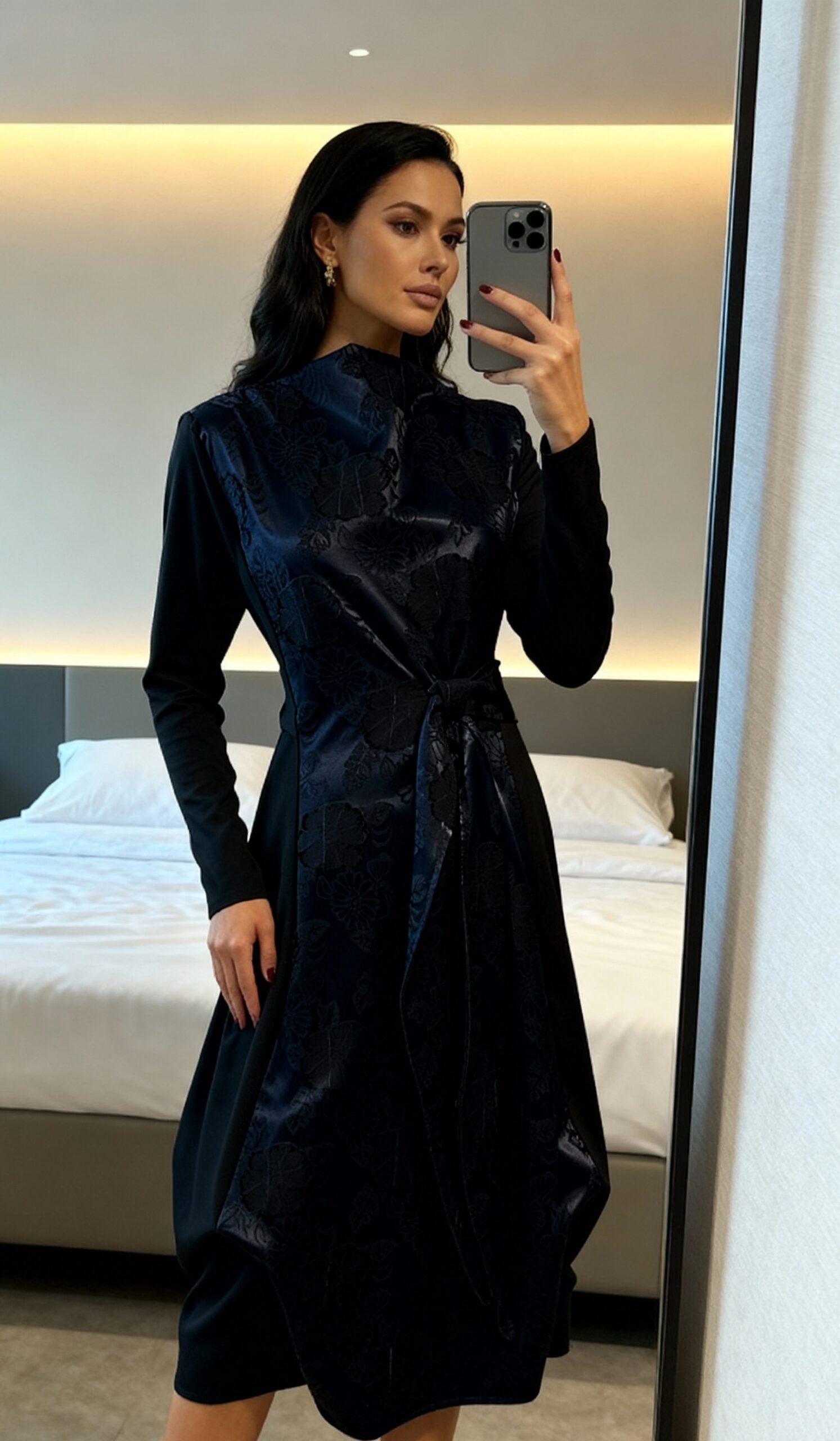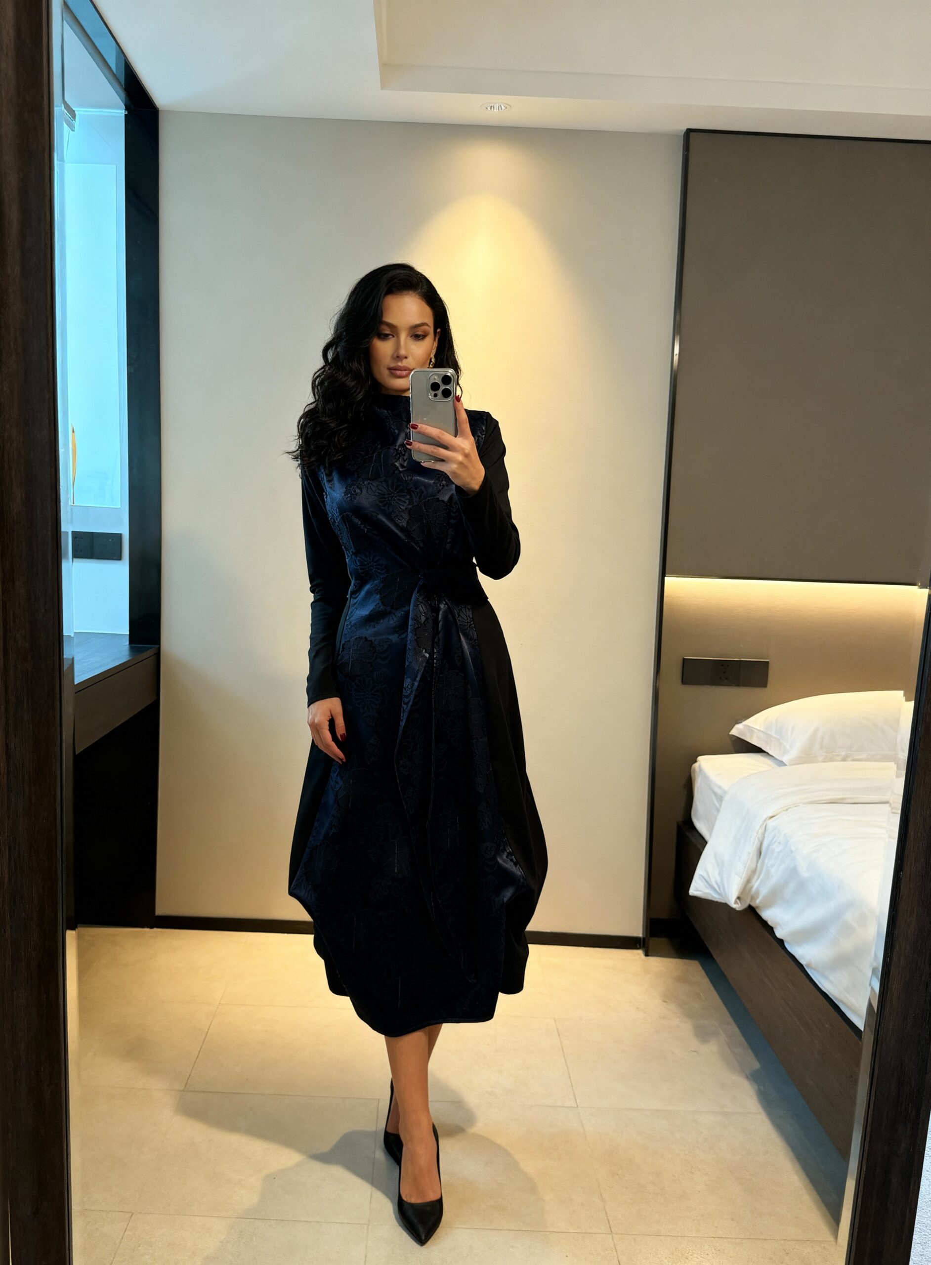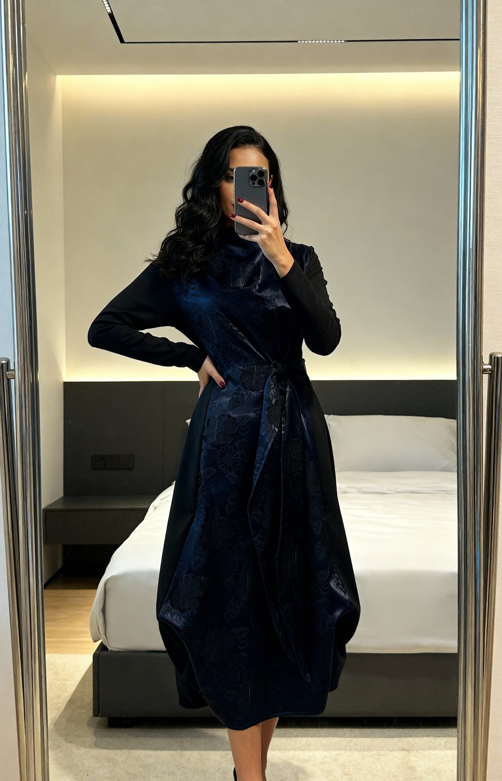 Haljina MOONA očarava raskošnim spojem tamnoplave baze i crnih detalja koji profinjeno uokviruju siluetu, dok 3D cvjetne aplikacije od crnog brokata daju dozu luksuza. Materijal se blago presijava — kako svjetlost pada, tako nježno otkriva svoj sjaj i naglašava bogatstvo teksture. Njezin jedinstveni kroj s decentnim volumenom stvara elegantnu liniju koja ističe struk i donosi dašak teatralne sofisticiranosti. Izrađena je s pažnjom na svaki detalj – od savršeno balansiranih proporcija do mekog pada tkanine.