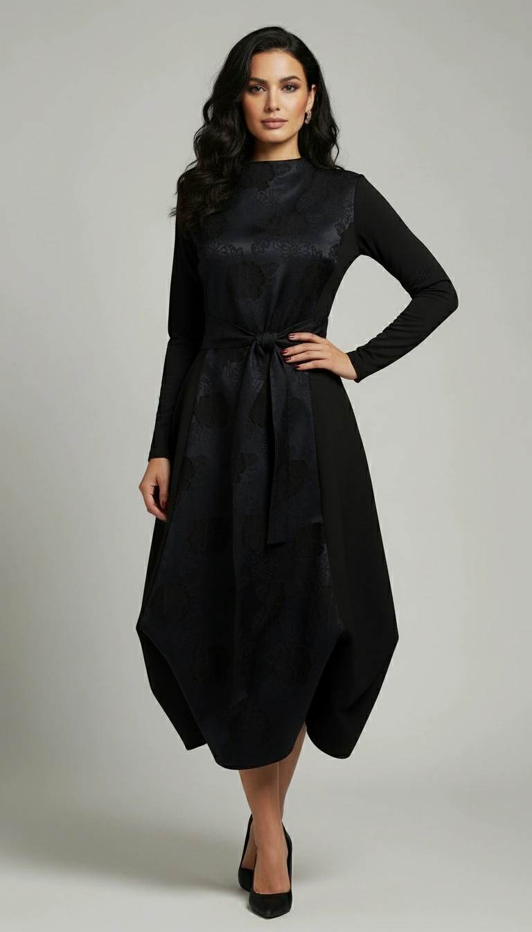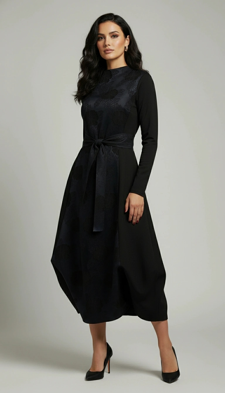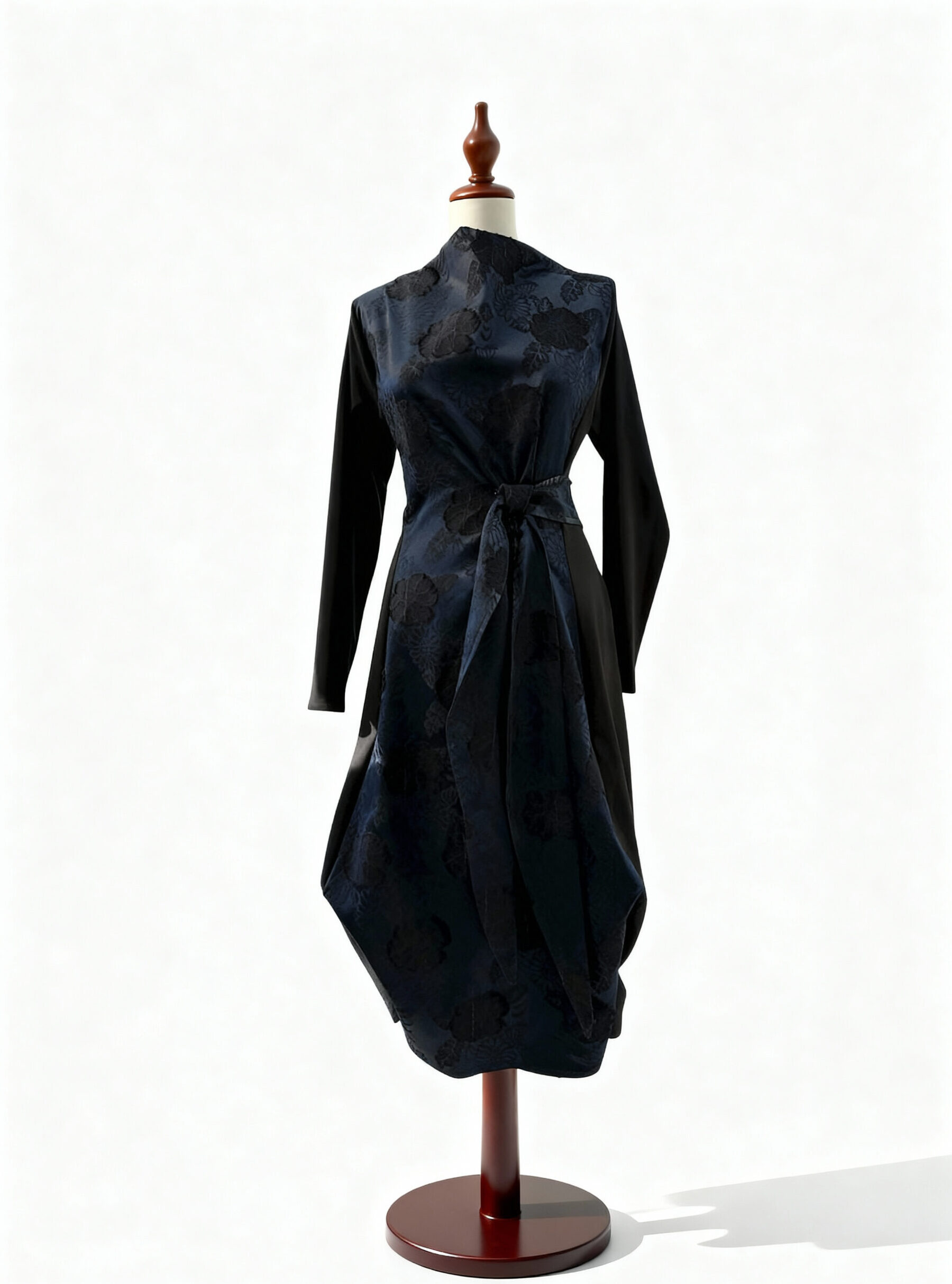 Haljina MOONA očarava raskošnim spojem tamnoplave baze i crnih detalja koji profinjeno uokviruju siluetu, dok 3D cvjetne aplikacije od crnog brokata daju dozu luksuza. Materijal se blago presijava — kako svjetlost pada, tako nježno otkriva svoj sjaj i naglašava bogatstvo teksture. Njezin jedinstveni kroj s decentnim volumenom stvara elegantnu liniju koja ističe struk i donosi dašak teatralne sofisticiranosti. Izrađena je s pažnjom na svaki detalj – od savršeno balansiranih proporcija do mekog pada tkanine.