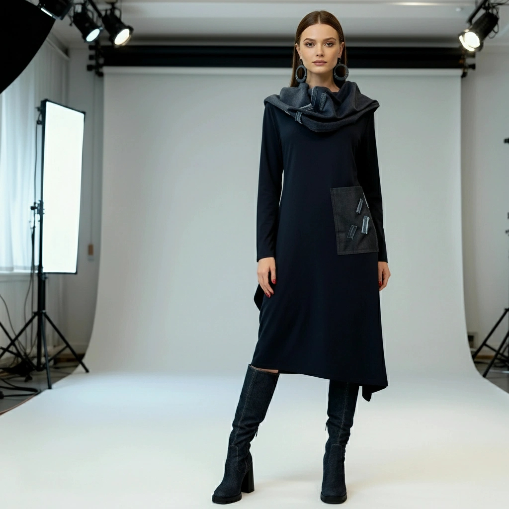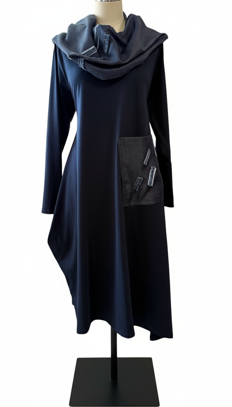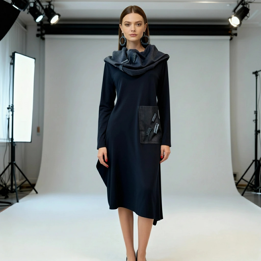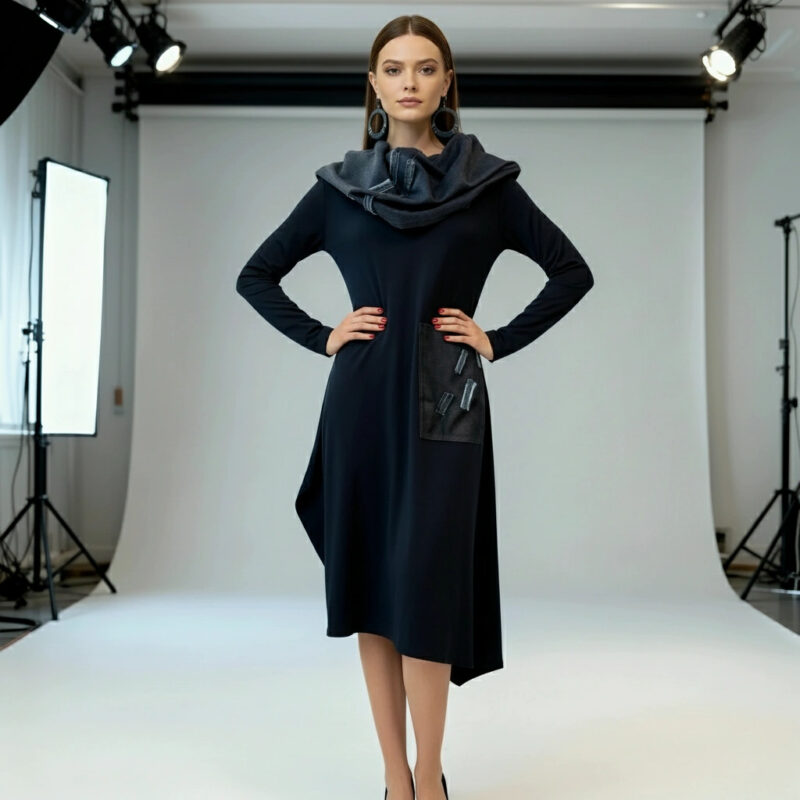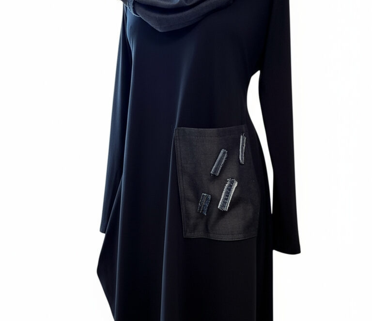 Haljina Neva odiše profinjenošću i jednostavnom elegancijom. Asimetričan kroj i velika džepna aplikacija od trapera daju joj umjetnički karakter, dok mekana tkanina i voluminozna šal-kragna oko vrata pružaju udobnost i dozu luksuza u svakom pokretu.