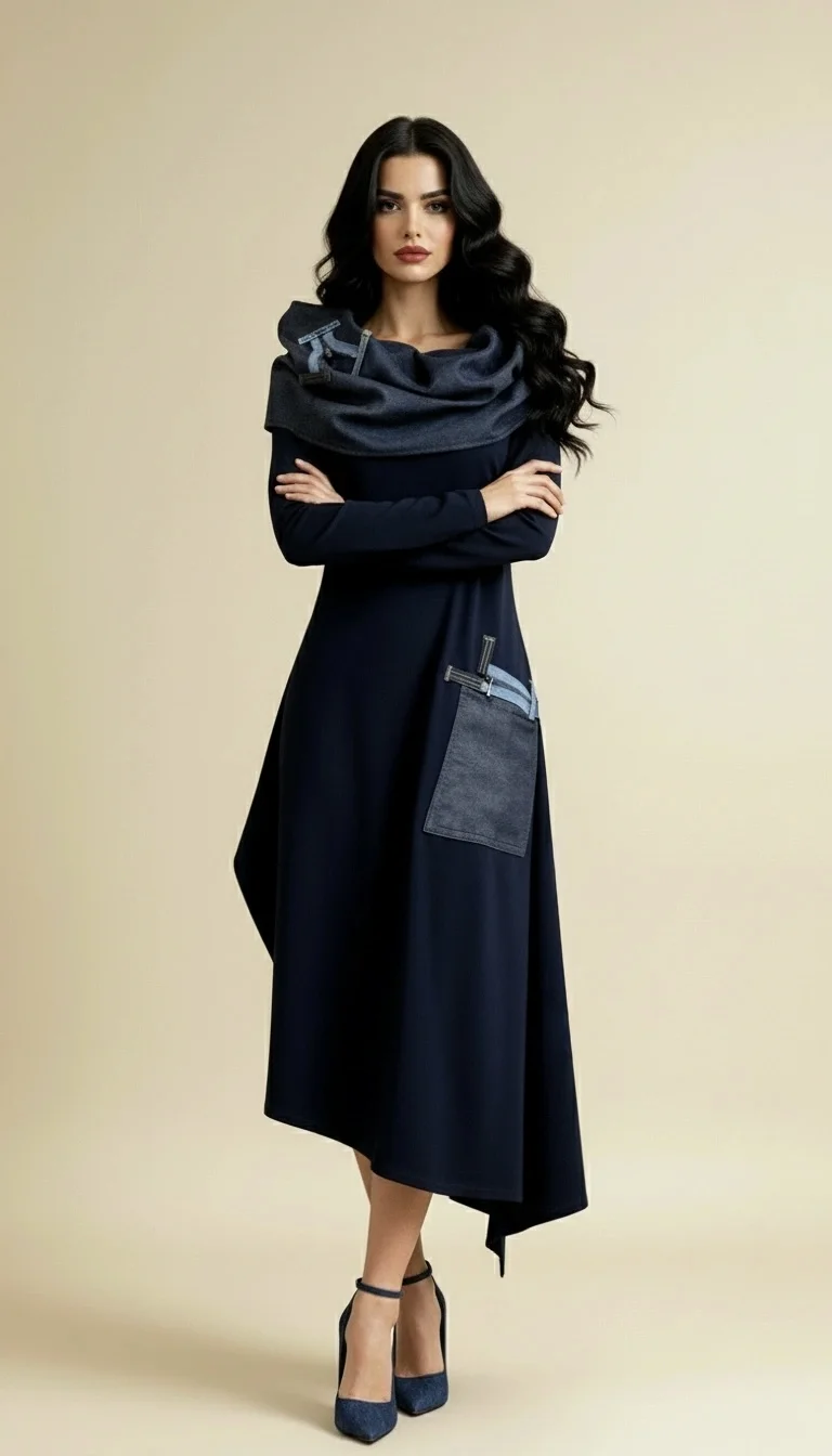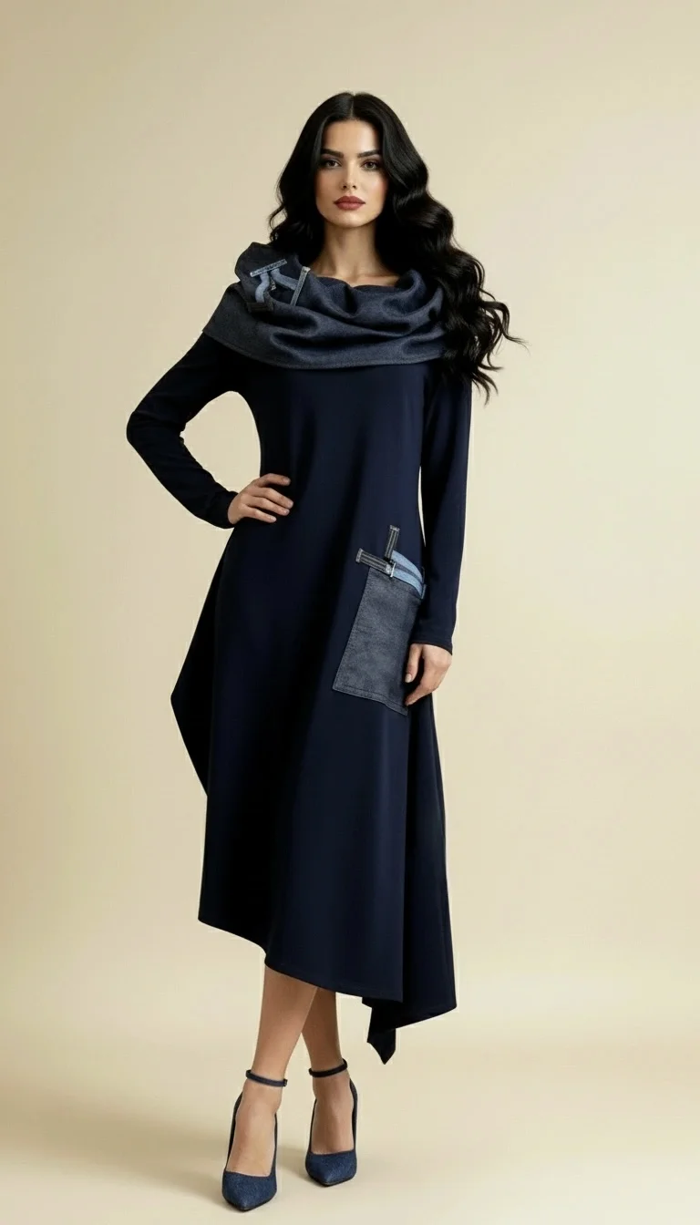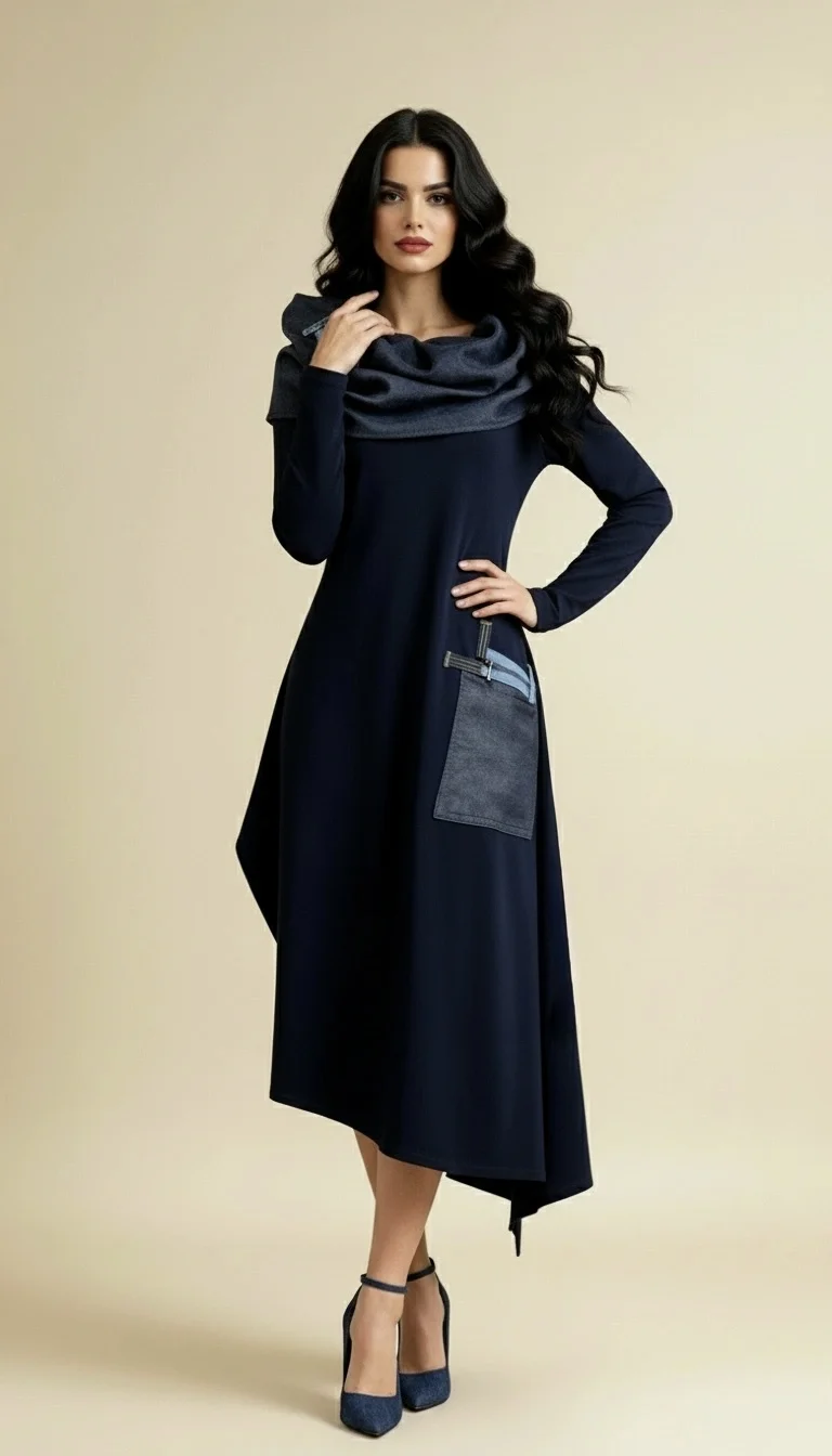 Haljina NINA spaja udobnost i eleganciju kroz tamnoplavu nijansu s upečatljivim traper detaljima. Asimetričan kroj i efektan ovratnik stvaraju poseban, upečatljiv dojam, dok veliki džep s ukrasnim trakama dodaje praktičnost i unikatnost. Idealna je za sve prigode u kojima želite izgledati profinjeno, ali i jedinstveno.
