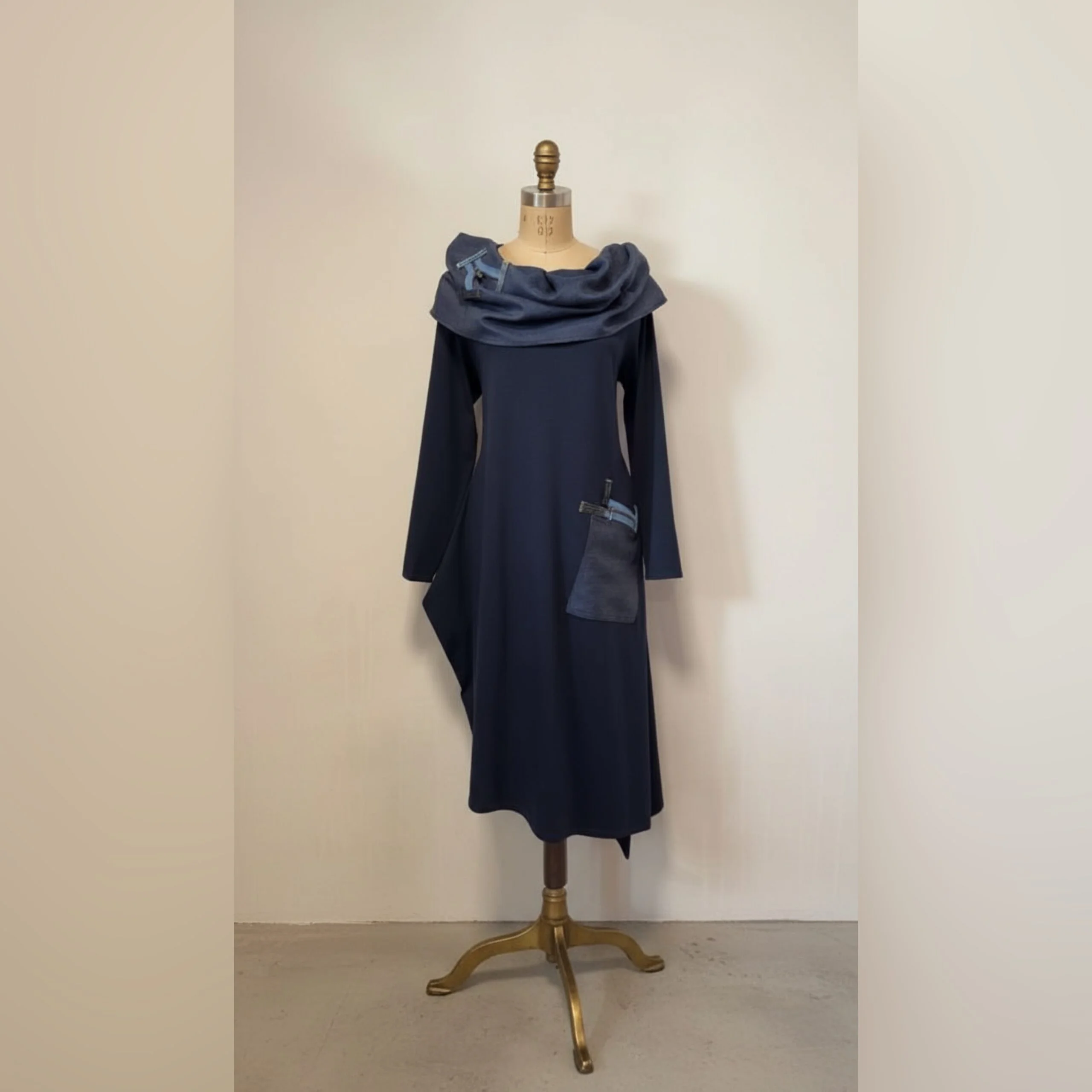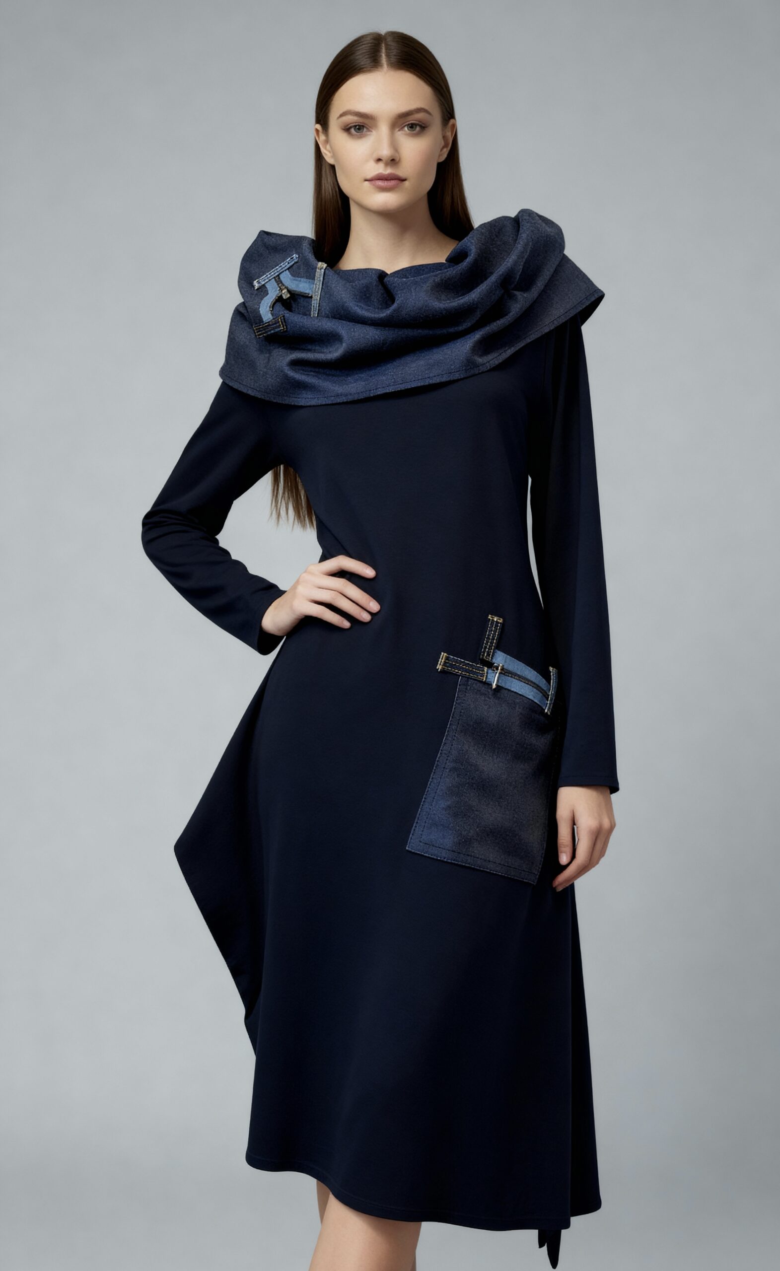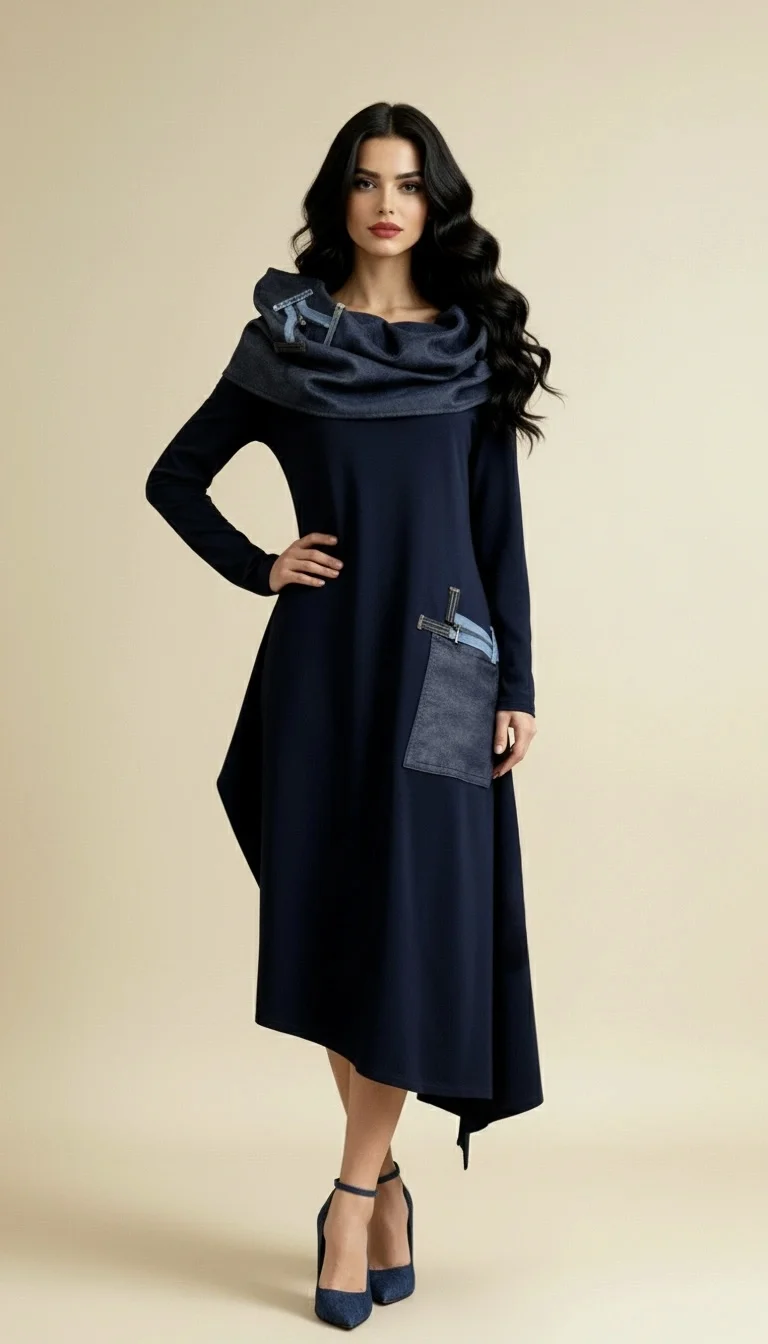 Haljina NINA spaja udobnost i eleganciju kroz tamnoplavu nijansu s upečatljivim traper detaljima. Asimetričan kroj i efektan ovratnik stvaraju poseban, upečatljiv dojam, dok veliki džep s ukrasnim trakama dodaje praktičnost i unikatnost. Idealna je za sve prigode u kojima želite izgledati profinjeno, ali i jedinstveno.