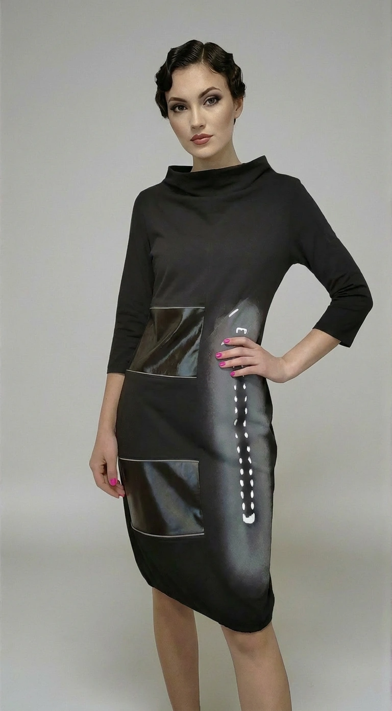 Haljina NOX LUMEN donosi snažnu, čistu siluetu u kombinaciji mat crne baze i sjajnih kožnih panela koji stvaraju dubinu i kontrast. Vertikalni bijeli detalj djeluje poput svjetlosnog traga na tamnoj površini, vizualno izdužujući figuru i naglašavajući arhitektonski karakter modela.