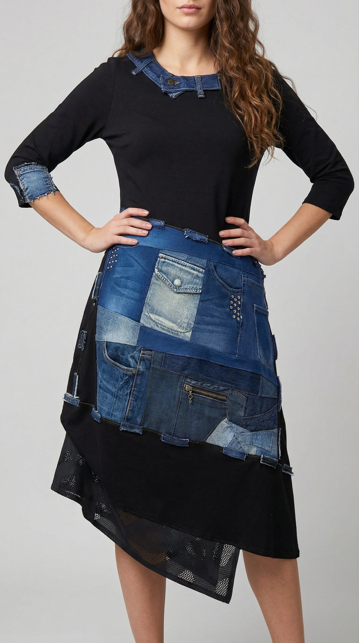 Haljina Traperinka osmišljena je za žene koje vole odvažan dizajn i urbanu estetiku. Gornji dio izrađen je od glatke crne tkanine čistih linija, dok središnji dio donosi bogati patchwork od trapera s vidljivim šavovima, džepovima, metalnim zakovicama i patentnim zatvaračem.