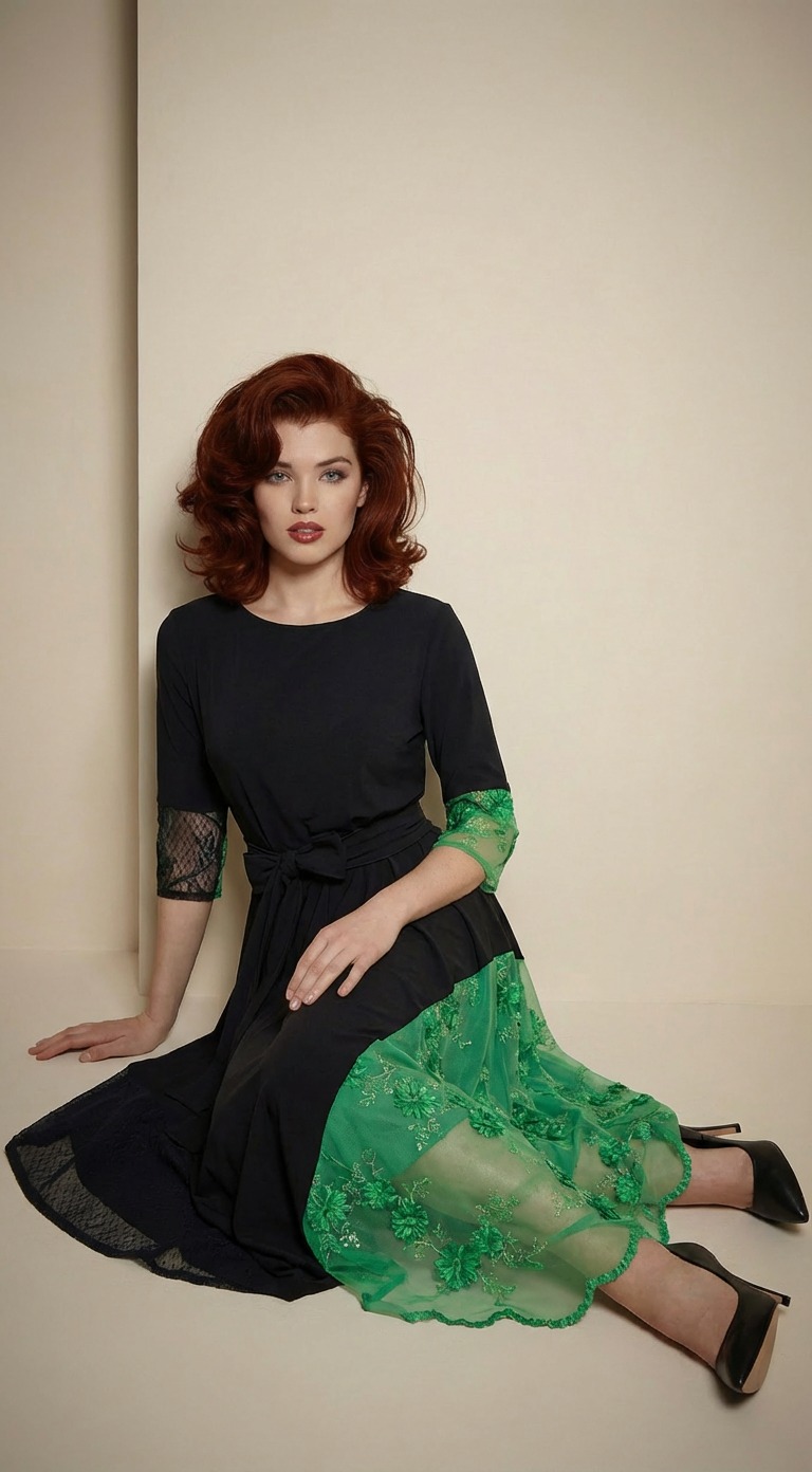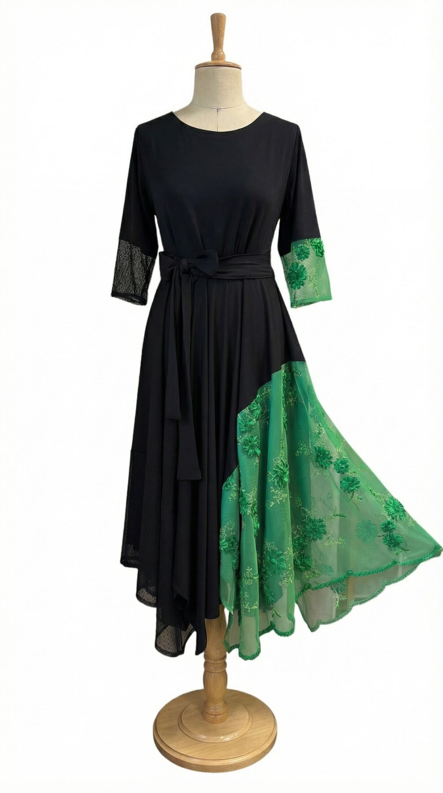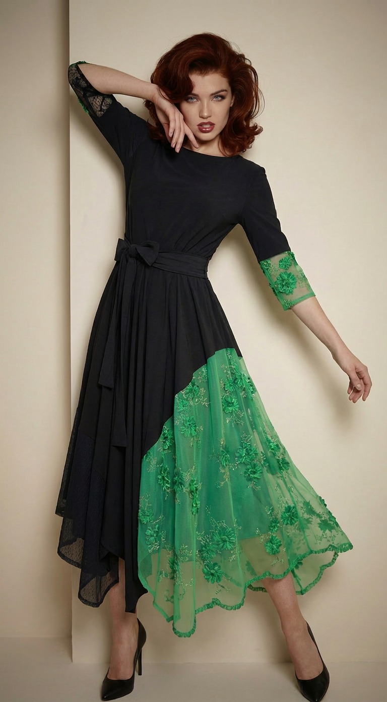 Sofisticiran kontrast: Duboka crna boja baze savršeno ističe vibrantne umetke od smaragdno zelene čipke s 3D cvjetnim vezom.
