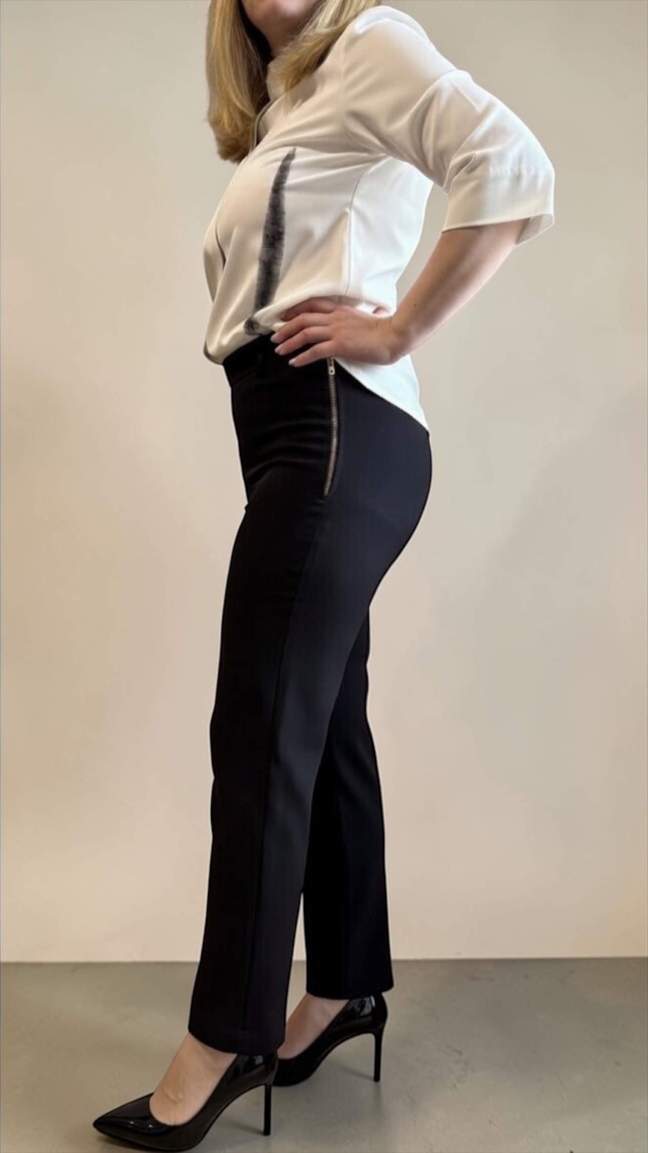 Uski kroj nogavica daje urban izgled, dok diskretni bočni patentni zatvarač održava čistu liniju bez suvišnih detalja. Rezultat je komad koji izgleda sofisticirano i suvremeno.