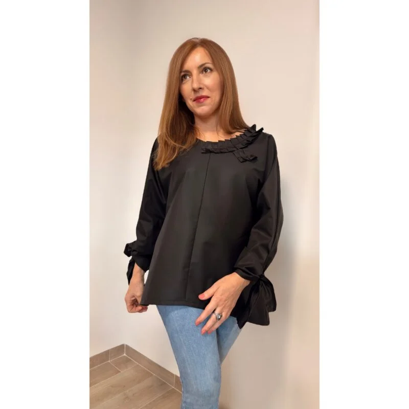Detalj: crna bluza s naboranim volanom uz izrez, elegantan minimalistički dizajn za posao i večer.