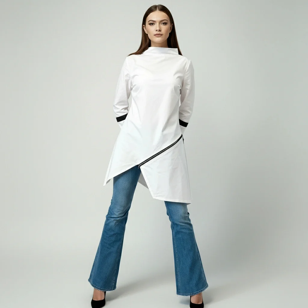 Košulja PARIS spaja eleganciju i avangardni dizajn. Asimetričan kroj s naglašenim crnim detaljima daje jedinstven izgled, dok kvalitetna bijela tkanina pruža udobnost i profinjenost. Idealan odabir za dame koje žele istaknuti svoj stil u svakoj prilici.