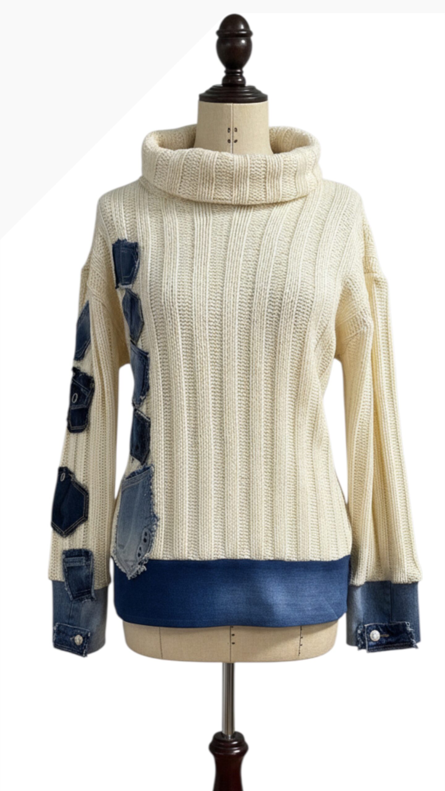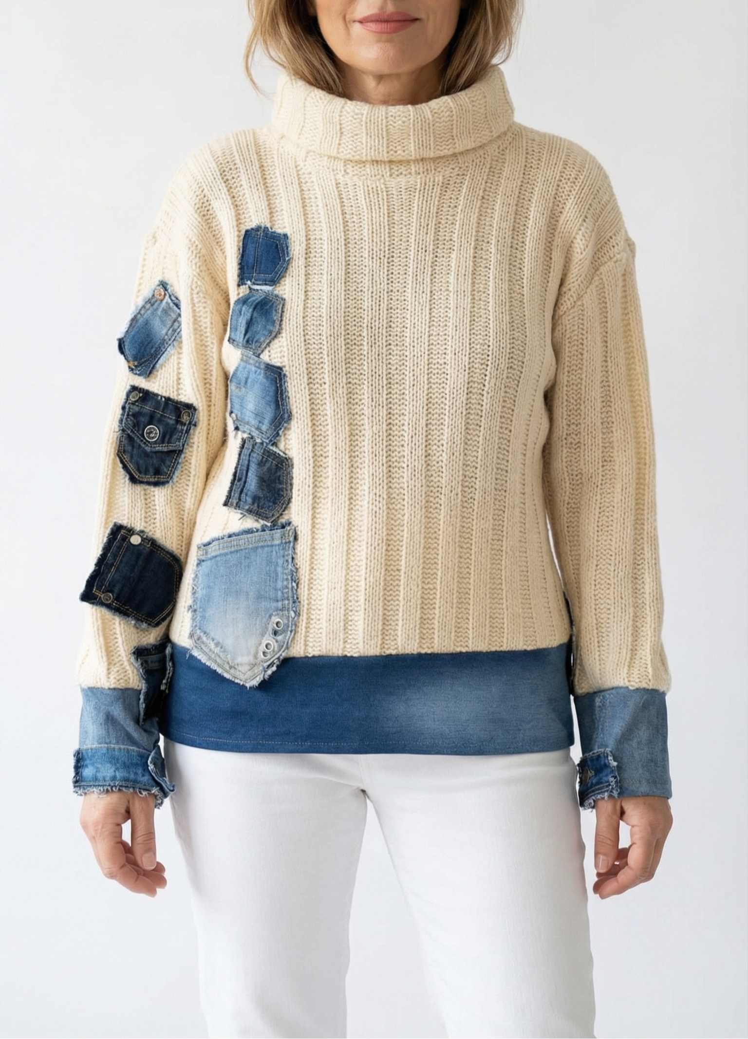Majica ALBAJEAN nije samo odjevni predmet, već modna izjava. Ovaj model iz Kuky dizajn kolekcije donosi savršen balans između toplog, rebrastog pletiva u krem boji i upečatljivih elemenata od trapera.
