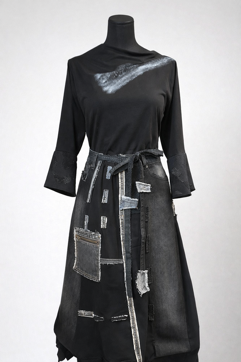 Crna, mat tkanina u kontrastu je sa suptilnim bijelim potezom preko prsa, koji djeluje poput ručno nanesene teksture i daje umjetničku notu cijelom komadu. Rukavi završavaju perforiranim detaljima koji unose lakoću i prozračnost, bez narušavanja snažnog karaktera dizajna.