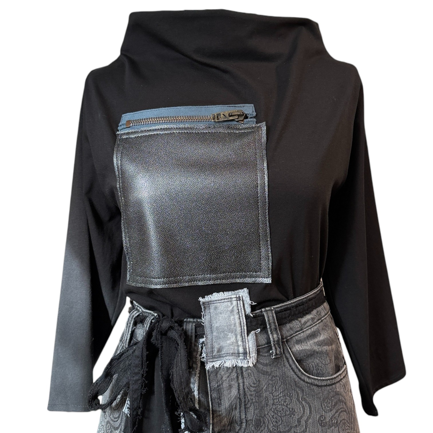 Majica NOXARA donosi snažan vizualni identitet kroz jedinstven kroj, visoki drapirani ovratnik i izraženi metalik džep sa zatvaračem koji funkcionira kao centralni statement element.