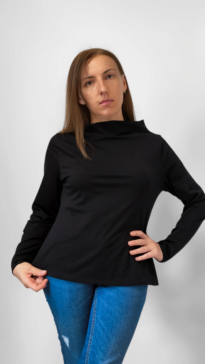 Unikatna crna majica s zanimljivim vratnim izrezom.