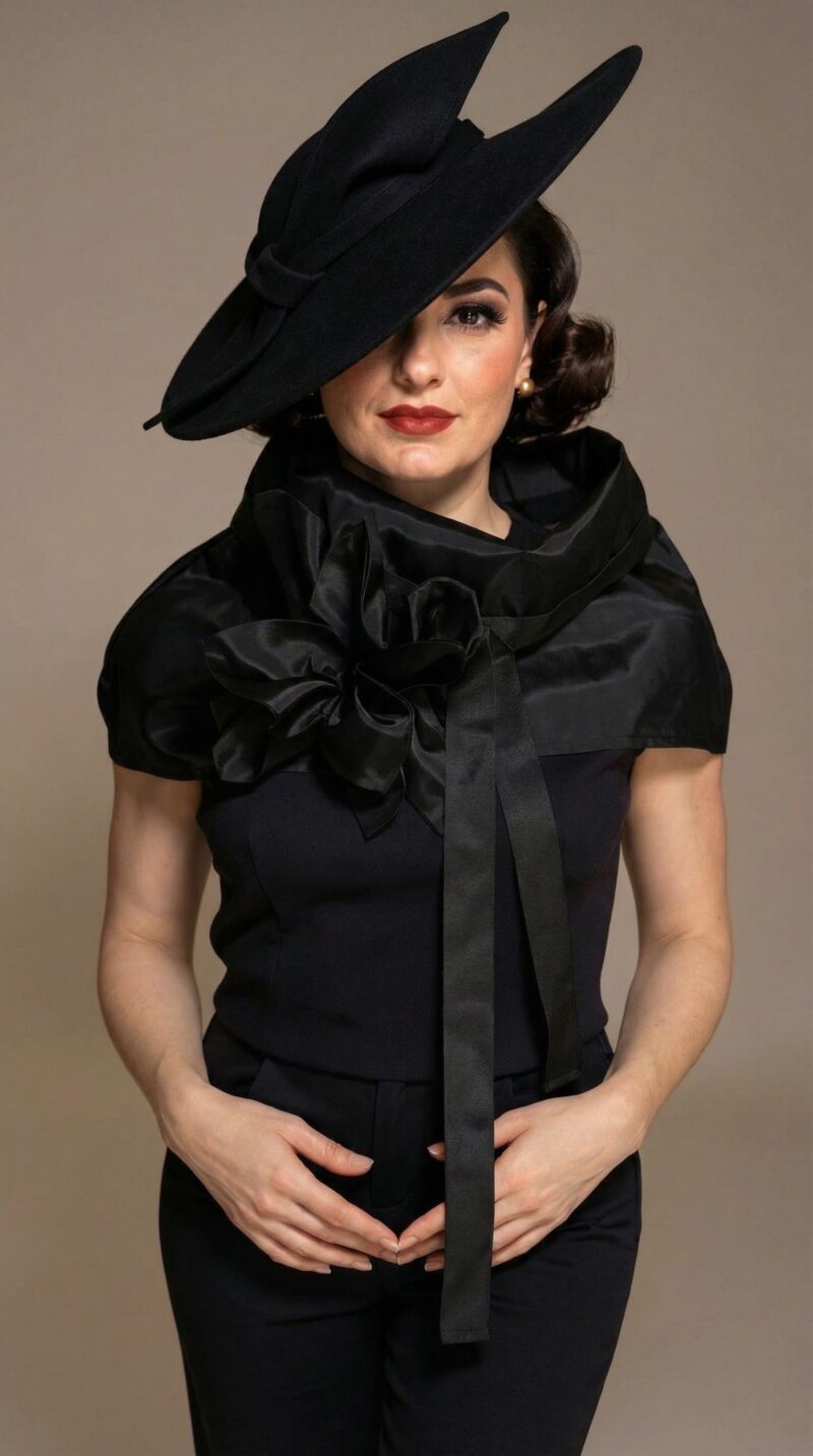 Duge trake koje se spuštaju niz prednji dio tijela dodaju pokret i produžuju siluetu, podsjećajući na estetiku klasične europske elegancije sredine 20. stoljeća. Ovratnik je nosiv, ali izražajan – nije kostim, već promišljen dizajnerski dodatak.