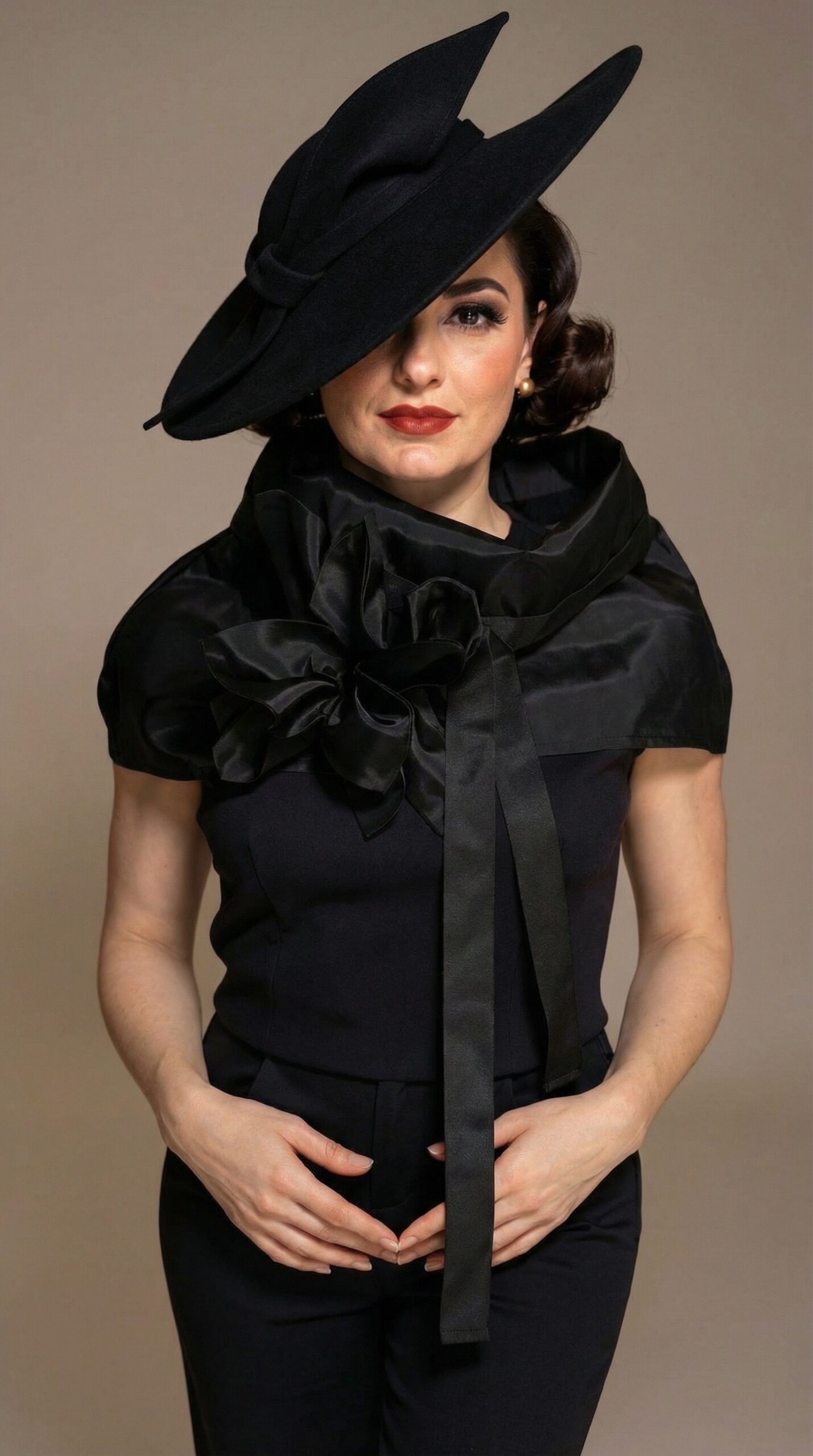 Ovratnik LA zamišljen je kao snažan modni akcent koji transformira i najjednostavniju odjeću. Izrađen od laganog, prozračnog crnog materijala, obavija ramena i vrat poput mekog ogrtača, dok ručno oblikovani cvijet na prednjem dijelu stvara jasan vizualni fokus.