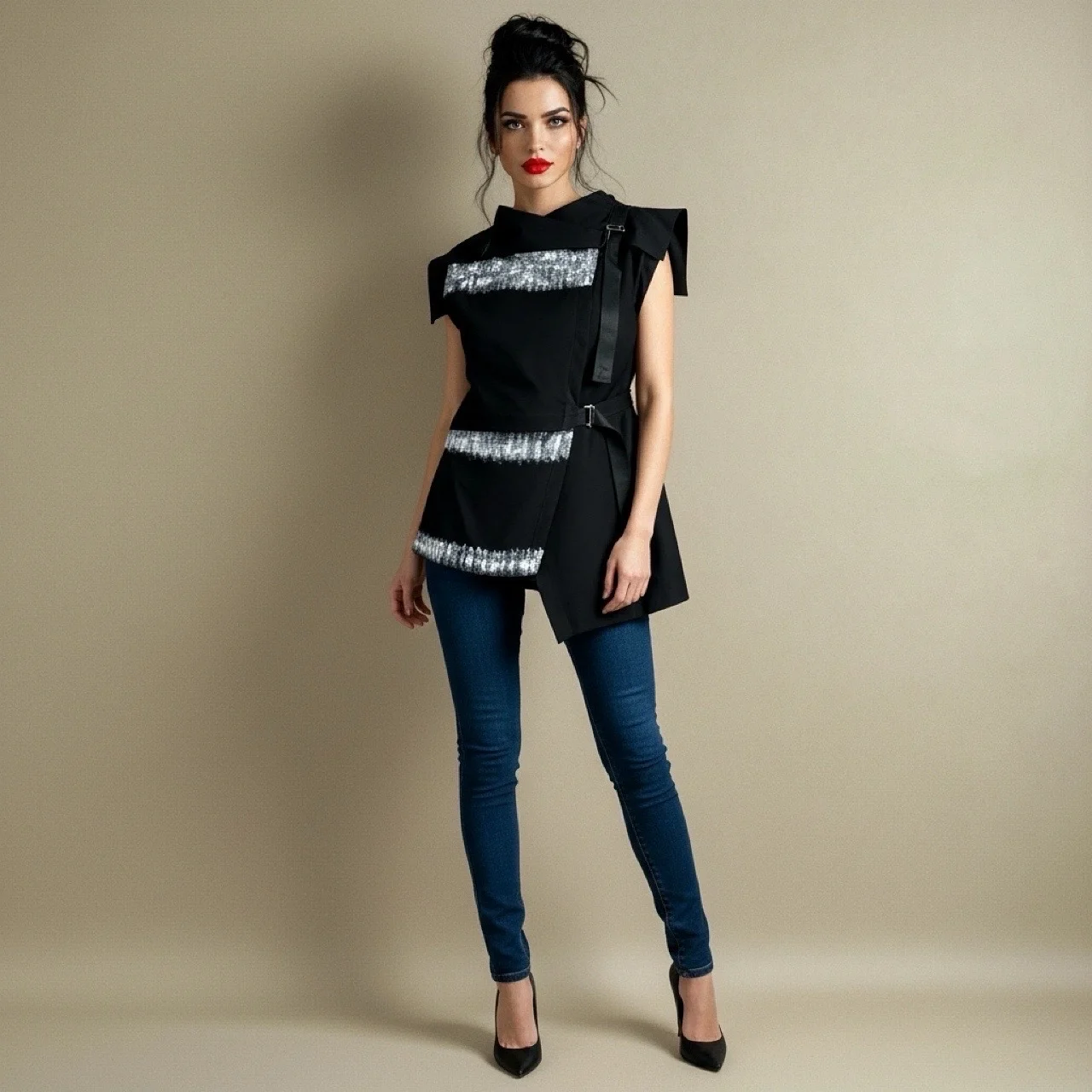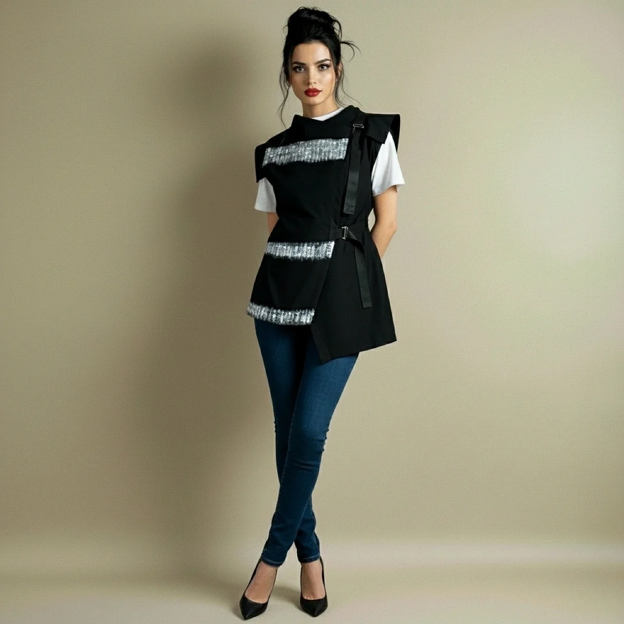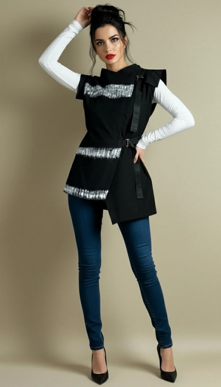 Prsluk ILLA donosi dozu elegancije i originalnosti u svakodnevni stil. Asimetričan kroj, remen s kopčom i ručno oslikani detalji stvaraju jedinstven spoj umjetnosti i mode. Sofisticiran komad koji naglašava osobnost i stil žene koja voli izražajan dizajn s karakterom.
