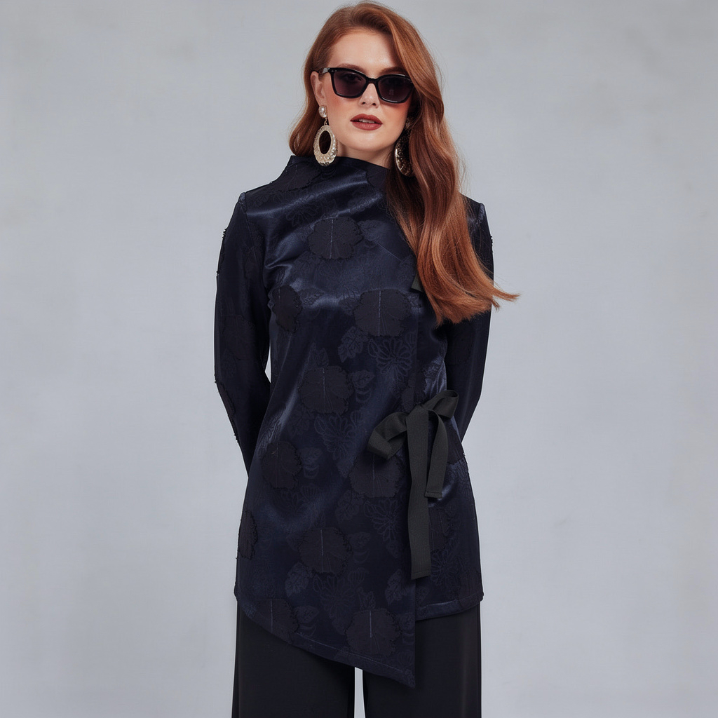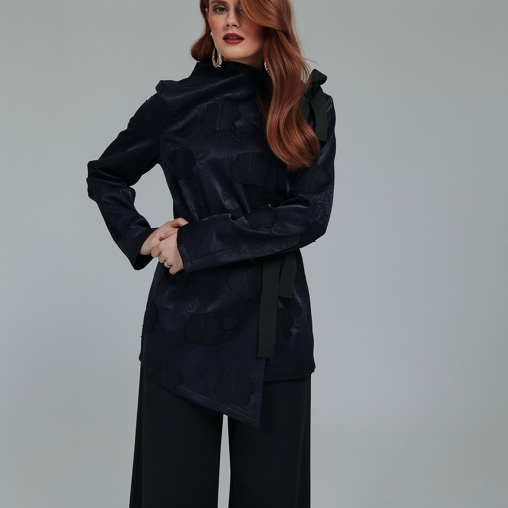 Sako Velaria spaja tamnoplavu eleganciju i izražajan 3D cvjetni brokatni reljef u moćan statement komad. Asimetrični kroj i vezanje u struku naglašavaju siluetu i daju sofisticiran, nosiv karakter.