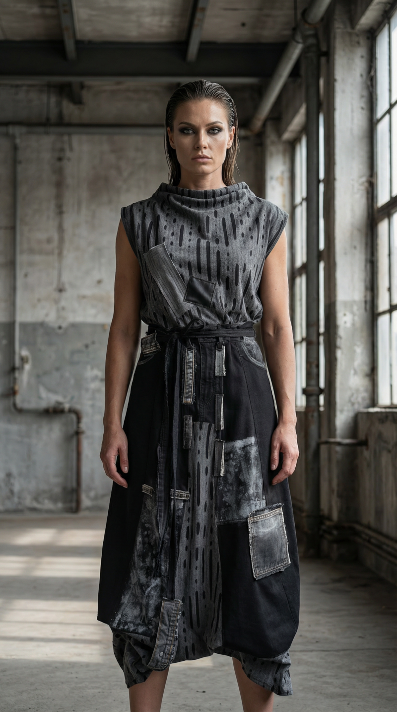 Suknja FRAGMENTA kombinira crnu strukturu, sivi grafički uzorak i denim umetke u slojevitoj, asimetričnoj, industrijskoj konstrukciji. Svaki panel djeluje kao zaseban fragment, ali zajedno tvore uravnoteženu cjelinu.