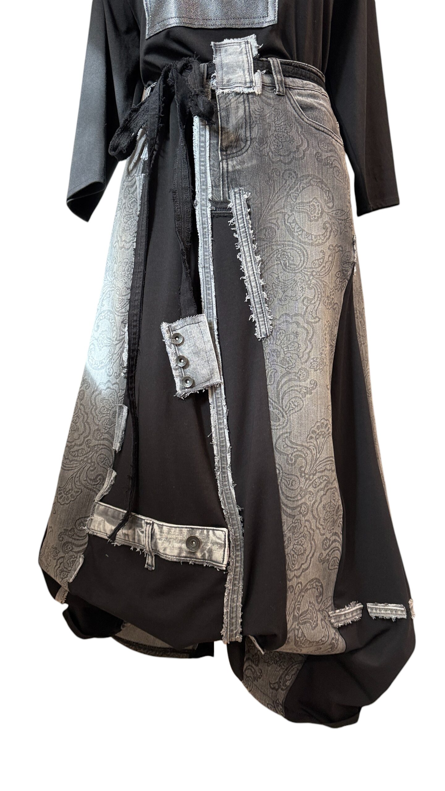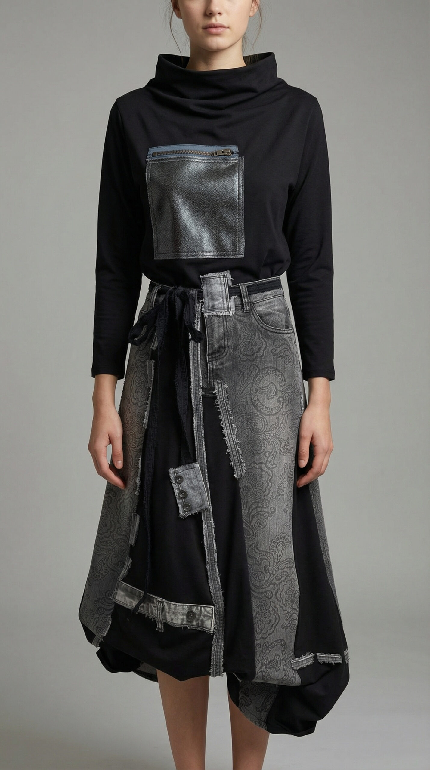 Suknja ROSELANI dizajnirana je kao snažan vizualni statement, gdje se crna baza susreće s sivim denim panelima, sirovim rubovima i naglašenim konstruktivnim detaljima.