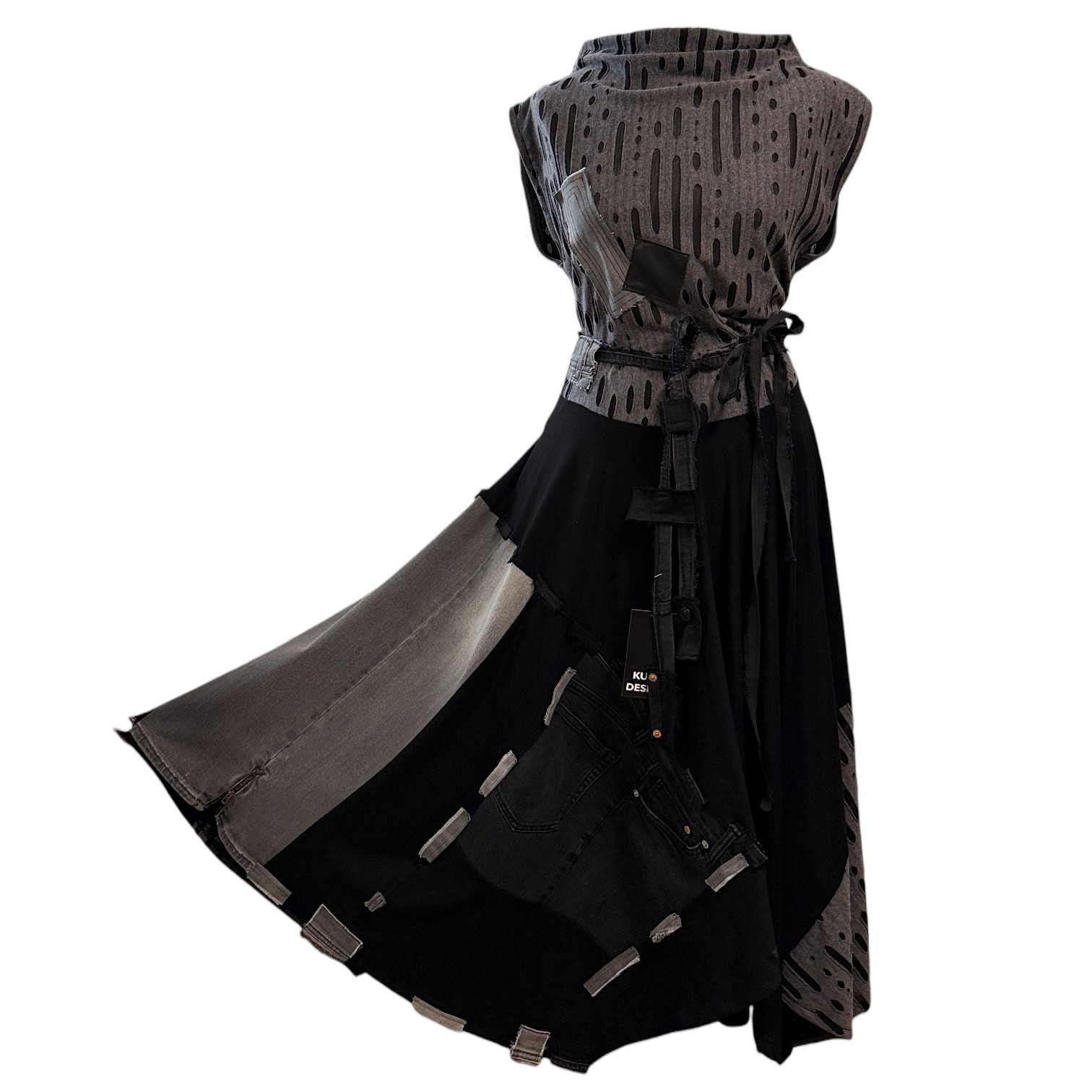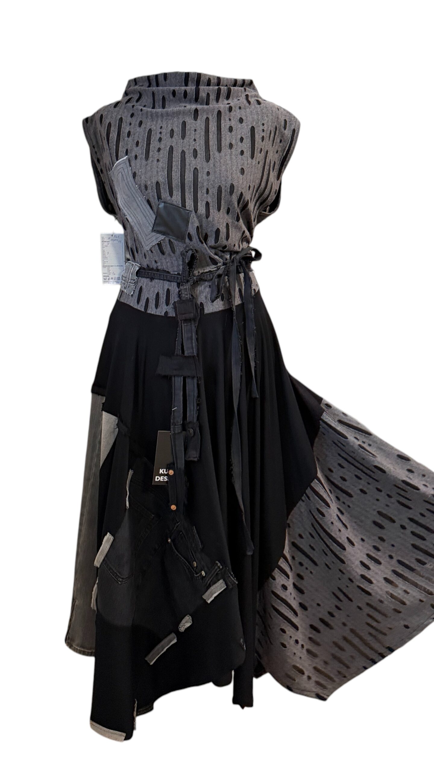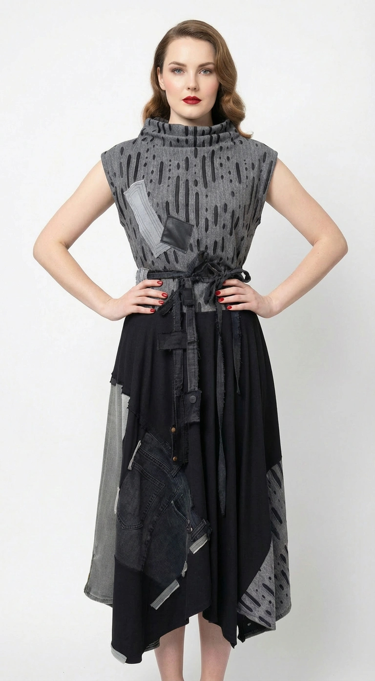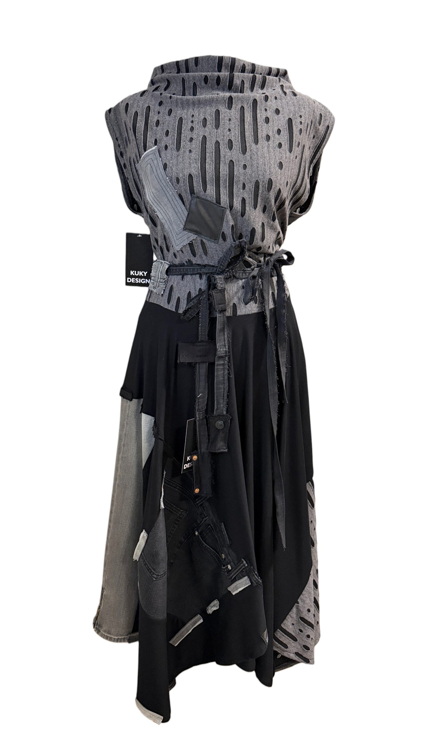 Suknja Veldra dizajnirana je kao statement komad za žene koje vole izražajan, nekonvencionalan stil. Izrađena je u kombinaciji crnih i sivih tonova s bogatim patchwork elementima, vidljivim šavovima i slojevitim strukturama koje stvaraju dinamiku u svakom pokretu.