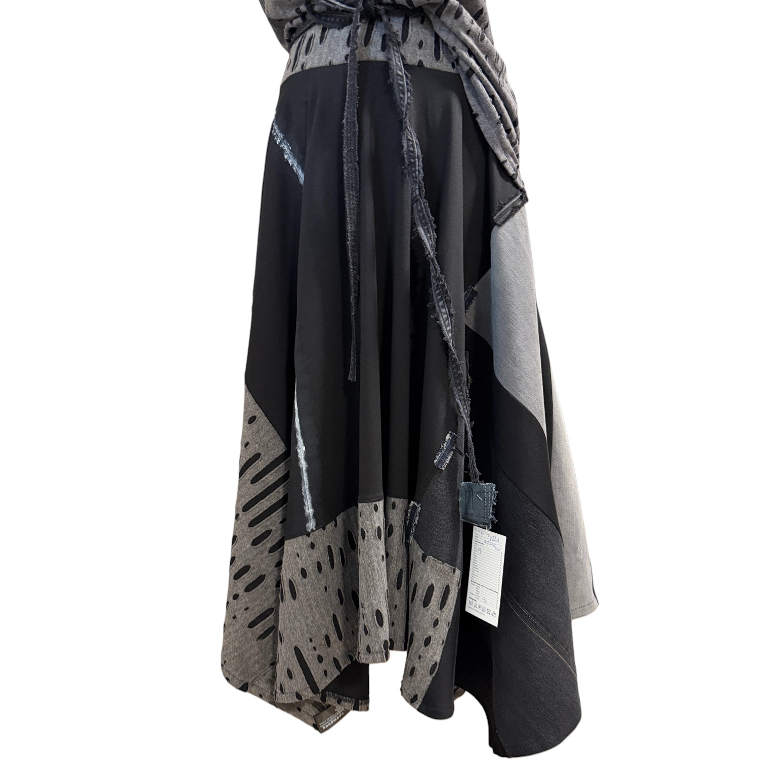 Patchwork konstrukcija spaja tamne i sive tonove u uravnotežen, ali nekonvencionalan dizajn. Suknja se lijepo ponaša u pokretu, lako se kombinira s jednostavnim gornjim dijelovima, ali i s izraženim statement komadima poput prsluka FLUX.