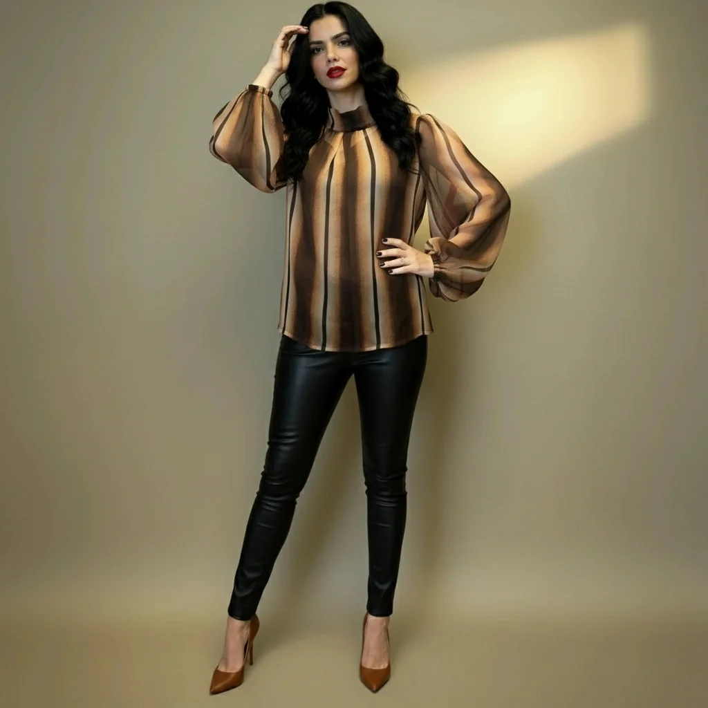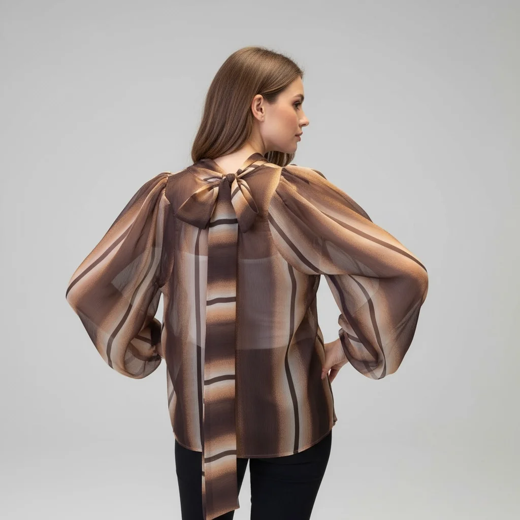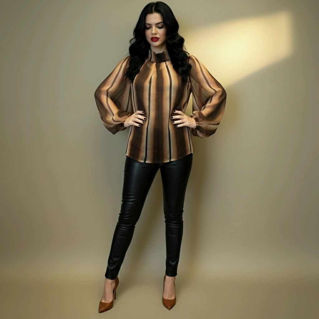 Košulja BARBARA odiše toplinom i profinjenošću, te unikatnim nijansama kave i karamele. Lagani materijal, široki rukavi i meke linije stvaraju savršen balans elegancije i udobnosti. Savršena za poslovne ili večernje kombinacije.