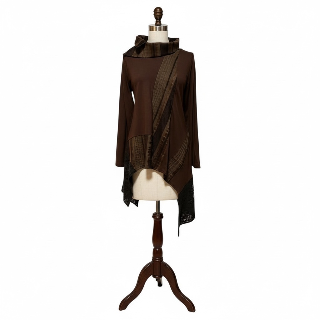 Unikatna tunika Bony je spoj topline, udobnosti i avangardne estetike. Bogati smeđi tonovi, asimetrični kroj i kombinacija teksturnih panela stvaraju efektan komad koji se lako uklapa u svakodnevni stil.