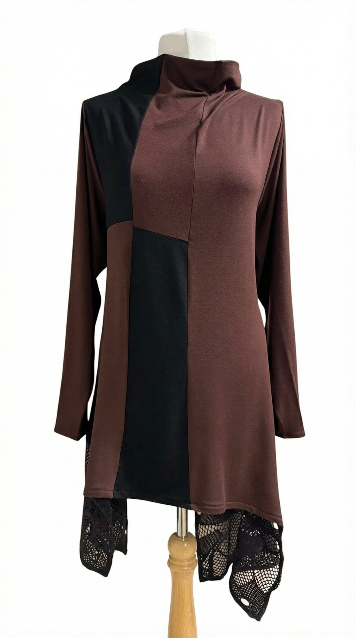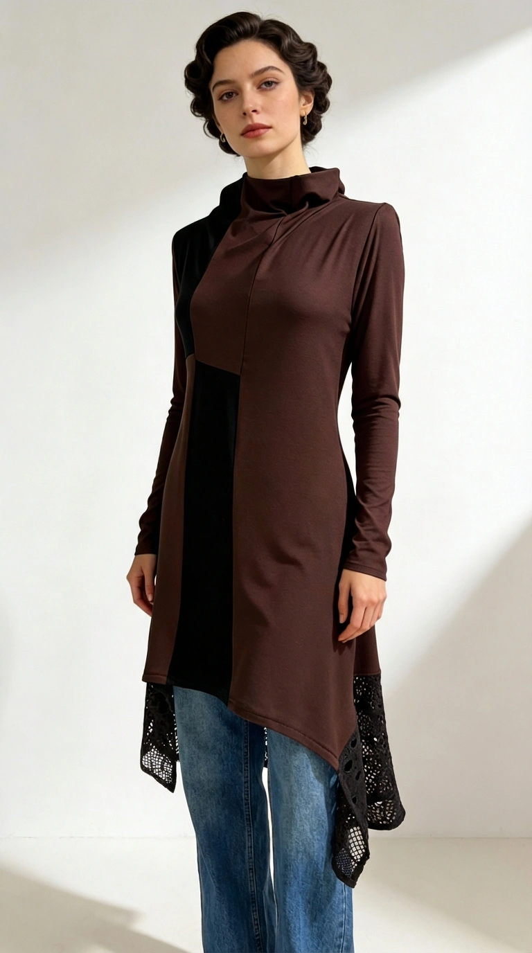 Asimetrična tunika KATY u smeđe-crnom kontrastu s čipkastim detaljima. Unikatan kroj, udoban materijal.