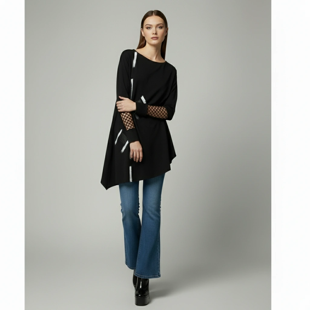 Pronađite savršenu crnu tuniku! MAURA donosi asimetriju, geometrijski print i mrežaste rukave za odvažan izgled.