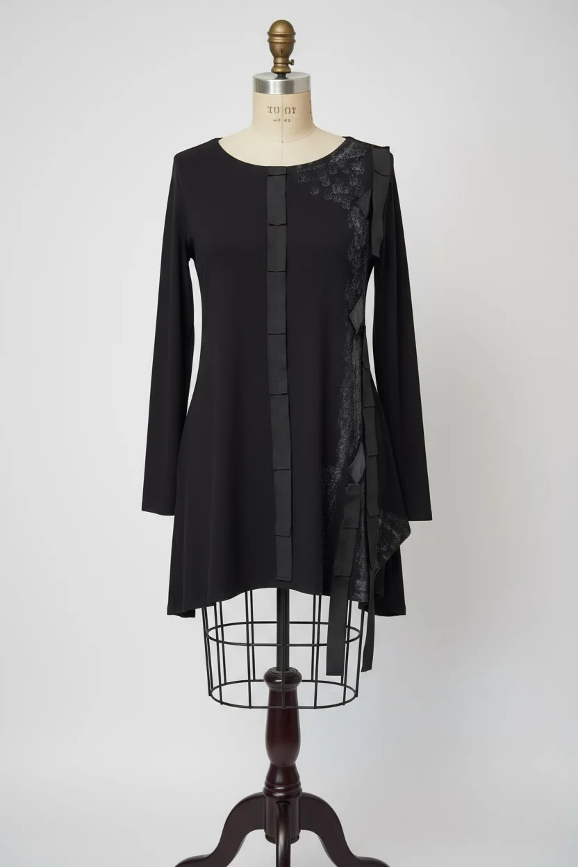 Tunika MAURINA utjelovljuje snagu tame i profinjenu jednostavnost. Asimetrični rez, detalji u tonovima crnog, te ručno oslikana prednjica daju joj arhitektonsku eleganciju, dok meka tkanina pruža udobnost i lakoću pokreta. Idealna za žene koje vole diskretnu sofisticiranost i suvremenu crnu estetiku.