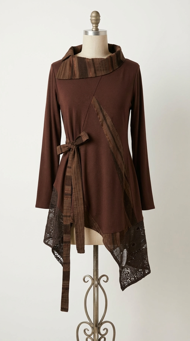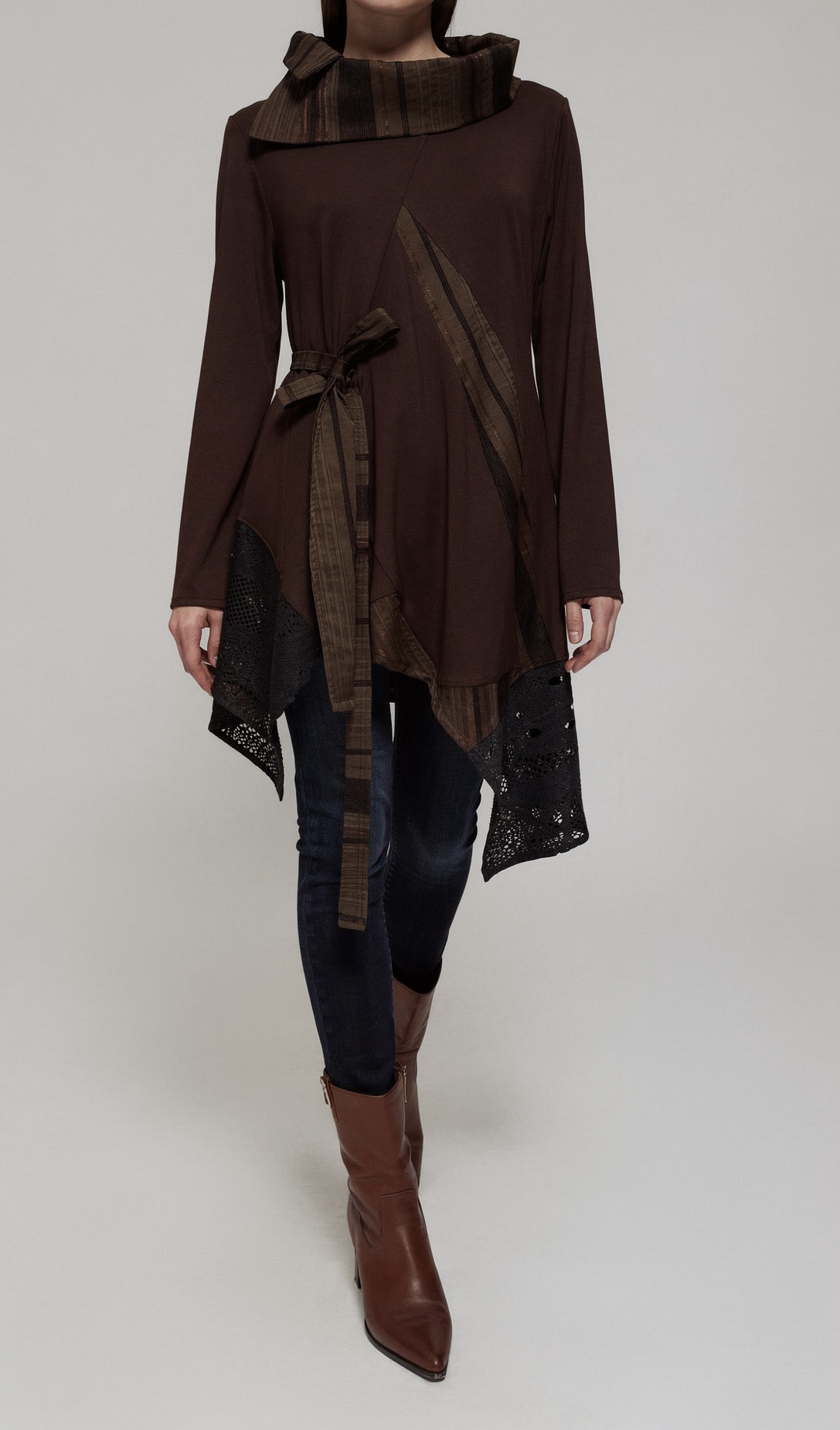 Tunika Nely je jedinstveni komad izrađen u samo jednom primjerku – idealna za žene koje žele naglasiti svoj autentičan stil. Kombinacija čokoladno smeđe nijanse, art trakastih umetaka i asimetričnog kroja stvara upečatljivu siluetu koja ne ostaje neprimjećeno.