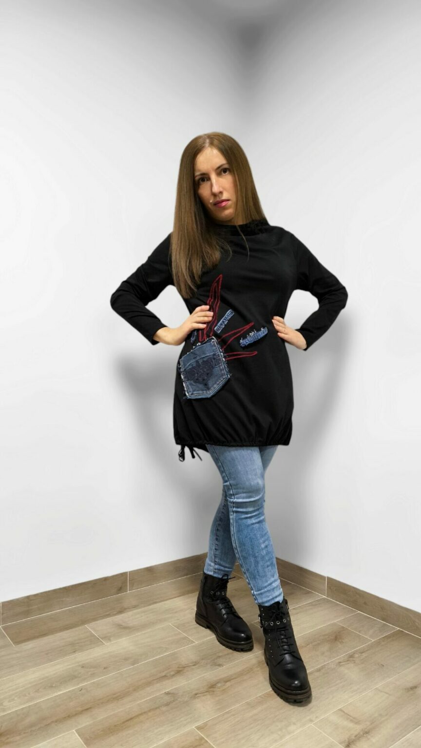 Predstavljamo tuniku RUSTIE – savršeni spoj udobnosti i stila za hladne jesenske i zimske dane! Ova crna tunika s unikatnim džepom od trapera i atraktivnim crvenim detaljima donosi dašak kreativnosti u svaki outfit. Duži kroj savršeno pristaje uz traperice ili tajice, dok praktični džep čini je i funkcionalnom.