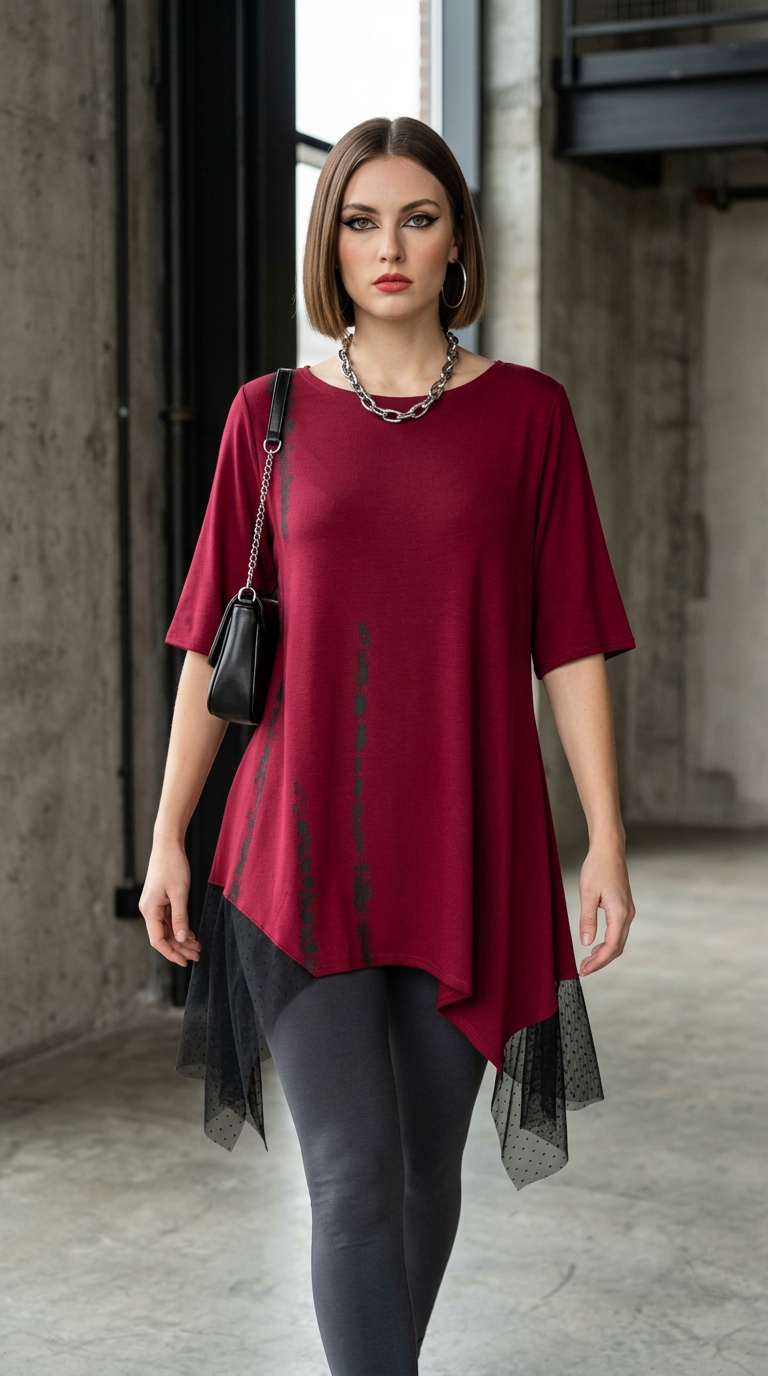 ZOJA je tunika koja balansira između snage i fluidnosti. Duboka bordo nijansa susreće crne apstraktne linije, dok asimetrični kroj i prozračni til stvaraju dinamiku pokreta.