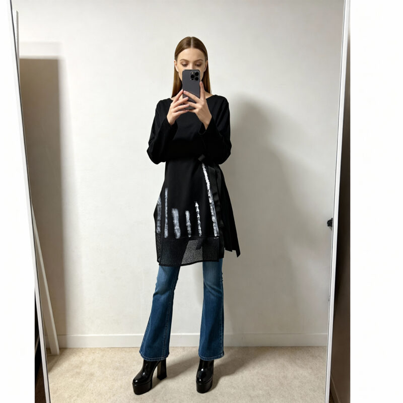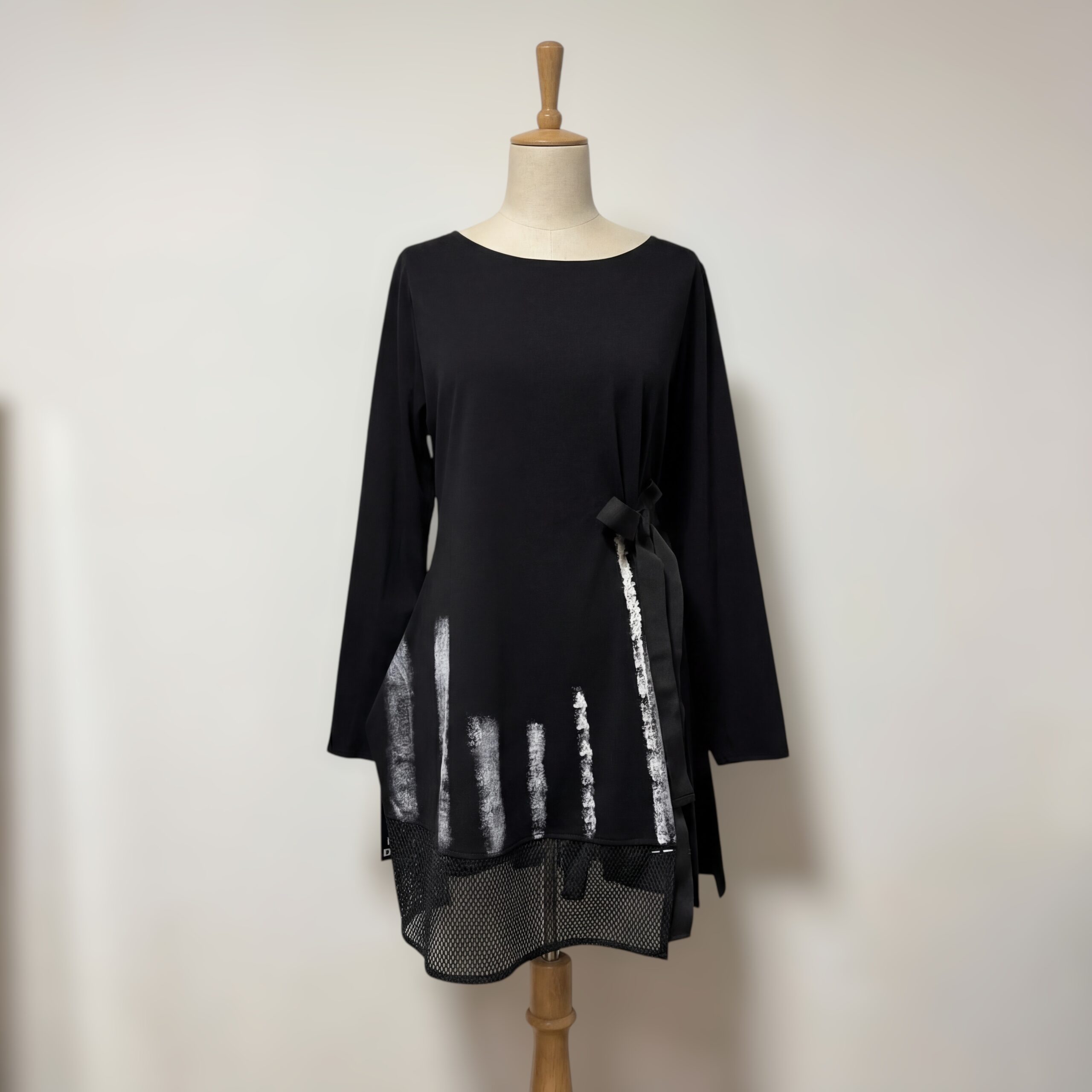 Tunika Zorka nosi onaj prepoznatljiv Kuky spoj jednostavnosti i umjetničkog izraza. Crna baza, ručno oslikani bijeli detalji i mrežasti donji dio stvaraju suvremen, pomalo edgy look koji odmah privlači pažnju. Asimetrični kroj vizualno izdužuje figuru, a bočni ukrasni vez daje dodatnu dimenziju. Mekana, ugodna i idealna za svaki dan — ali i za trenutke kad želiš izgledati posebno bez puno muke.